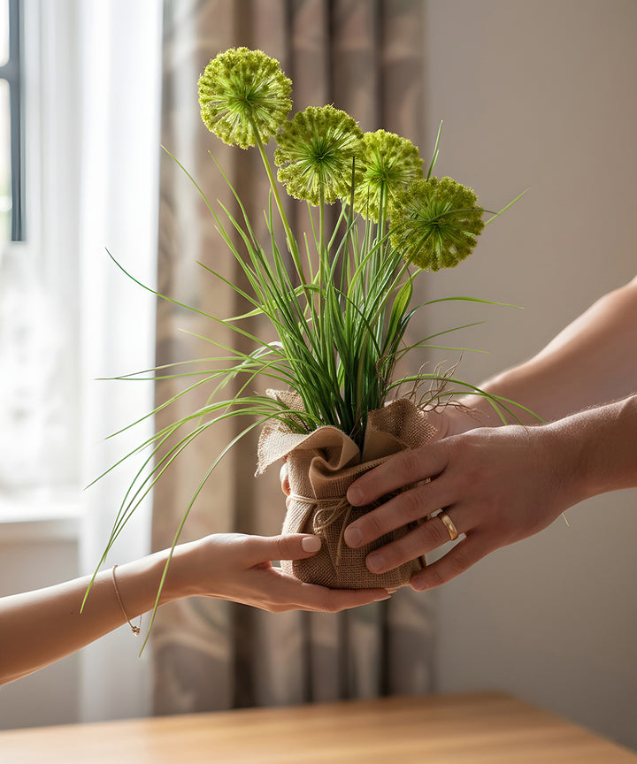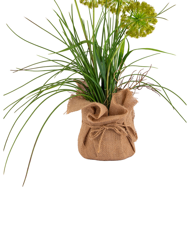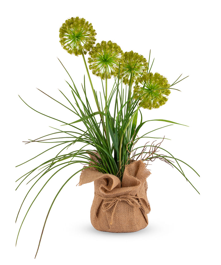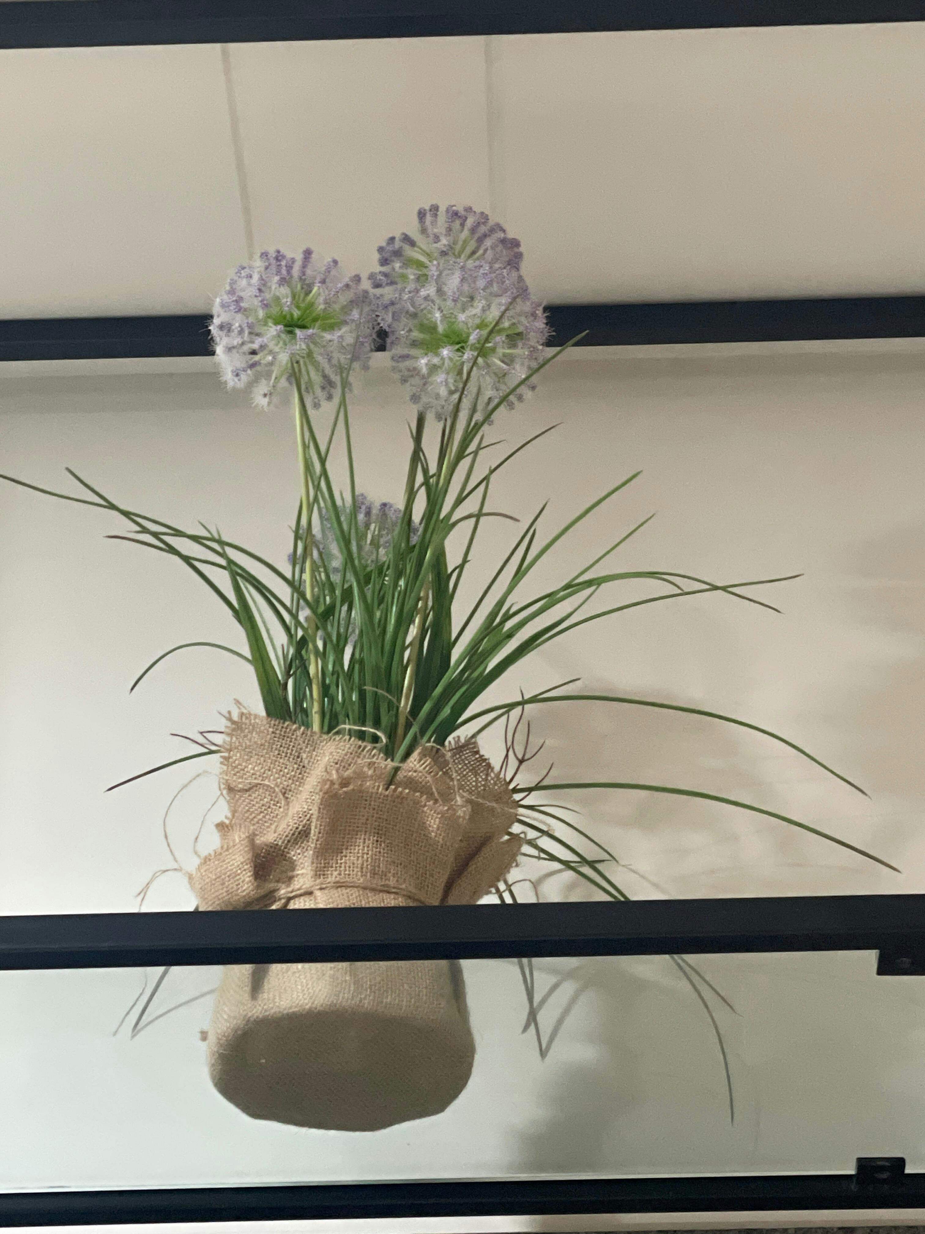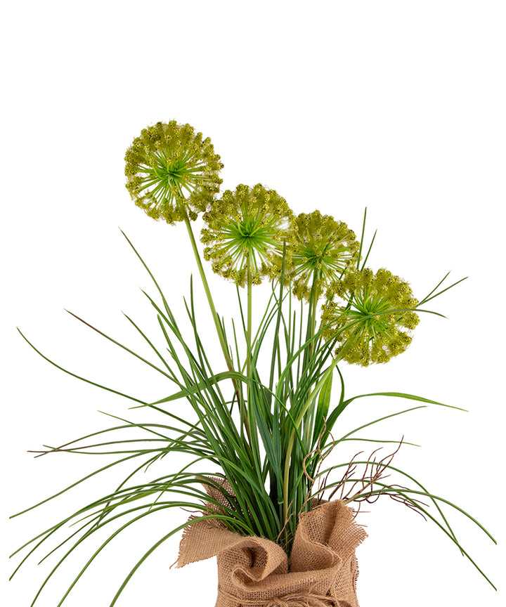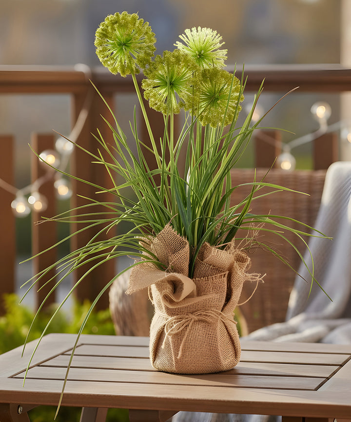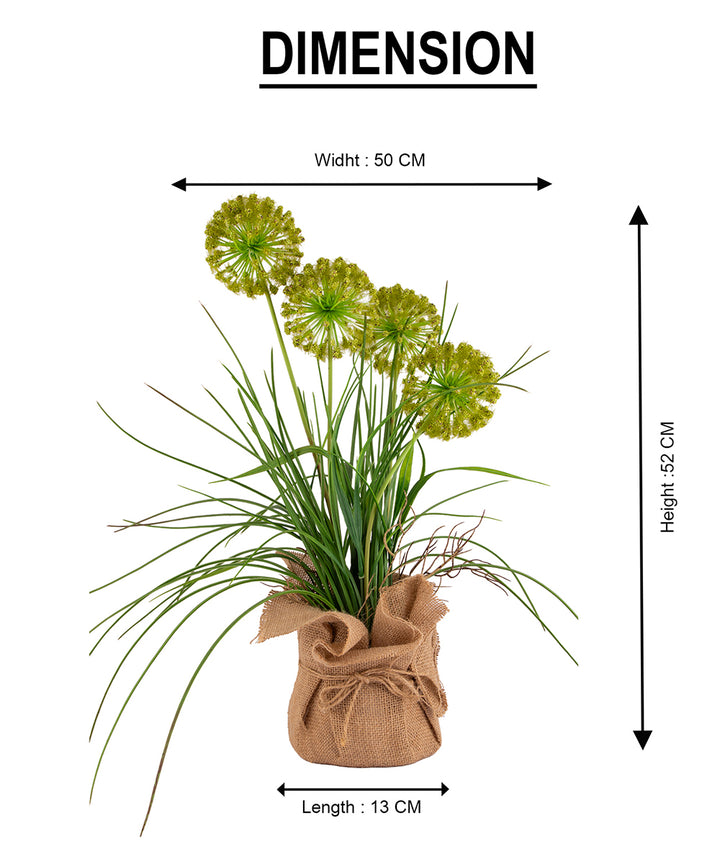 Elegant faux Allium flower arrangement in a rustic burlap-wrapped pot. Crafted with silk, plastic, and jute for a fresh look— Adds a touch of natural charm to any luxury space. Perfect for adding a touch of freshness and charm, these pots can be placed anywhere — in your living room, balcony, office desk, garden area, bathroom or entrance.