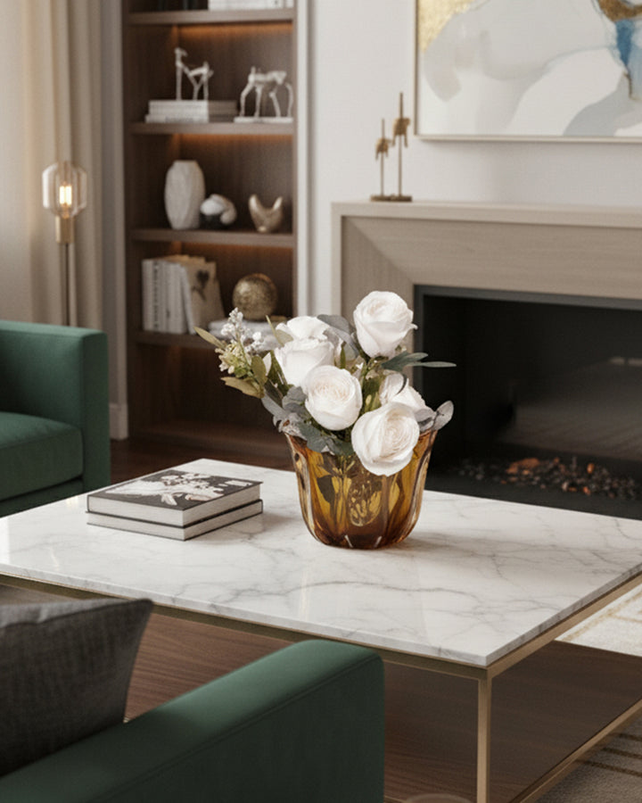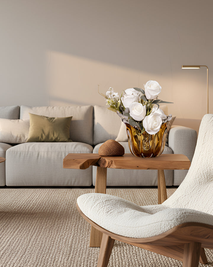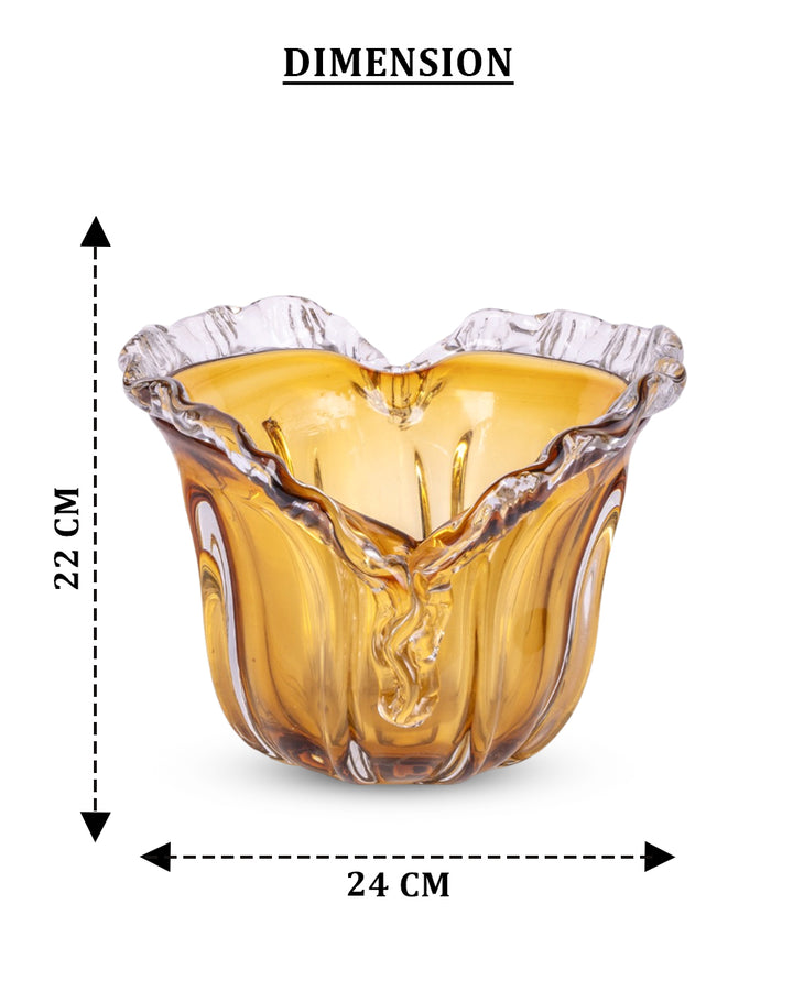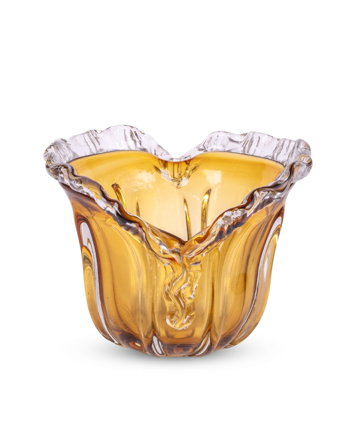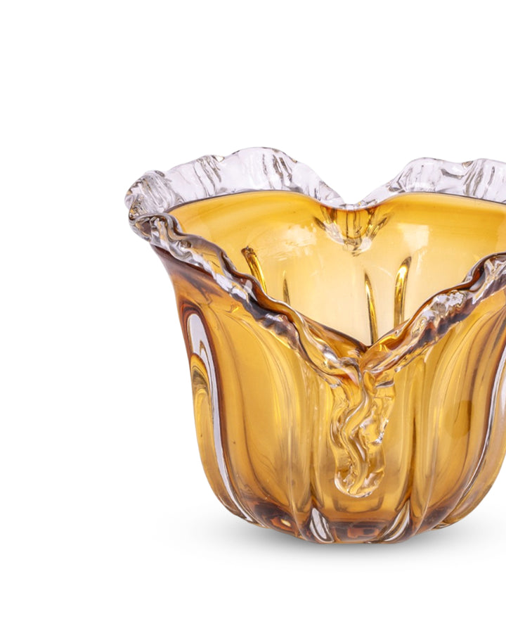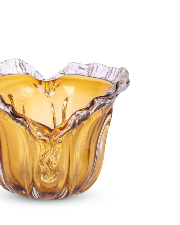 This is a striking amber-colored glass vase with an elegant and artistic design. This is a beautifully crafted glass vase with a rich amber hue. The vase has a delicate, organic shape with ruffled edges that are slightly transparent or frosted. The flowing design features smooth, curved lines running through the body, giving it an elegant, natural feel, reminiscent of a flower or a soft wave. The deep amber color contrasts with the clear edges, enhancing its intricate, artistic details. It appears to be a hand-blown piece, showcasing craftsmanship with its fluid, sculptural form. This vase would make a striking statement as a decorative centerpiece or floral display.