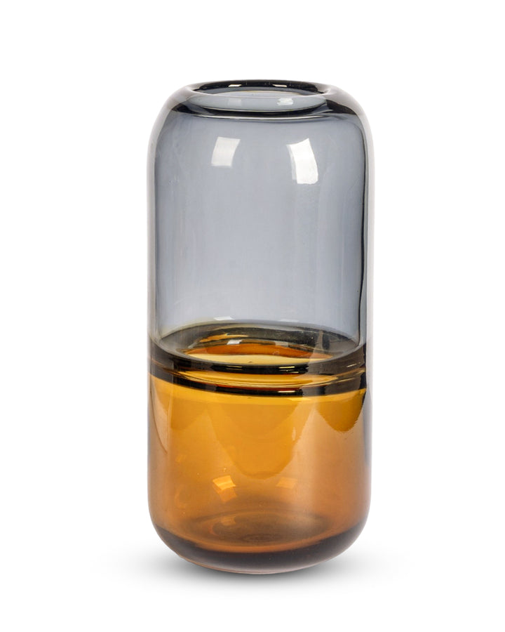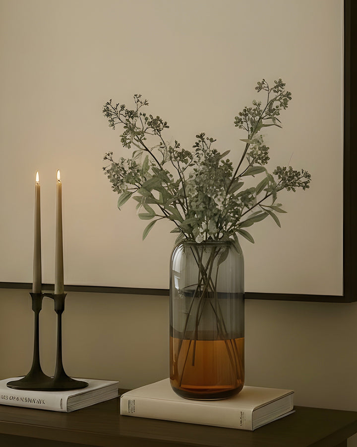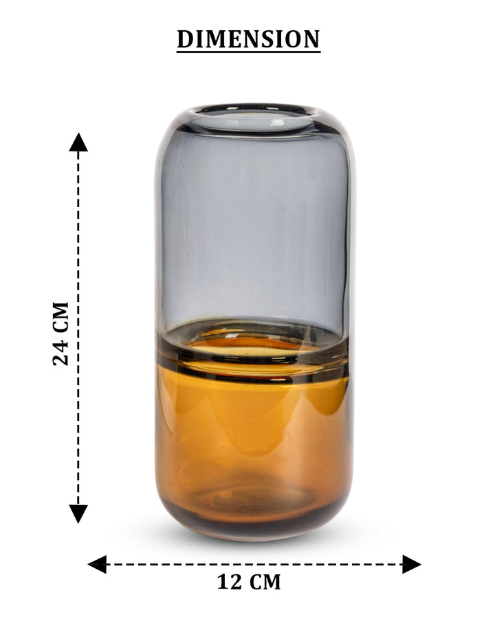 This tall luxury glass vase features a striking two-tone design, blending sophistication with modern elegance. The top half showcases a rich, smoky hue that gradually fades into a radiant golden base, creating a seamless gradient effect. Crafted from high-quality glass, the vase boasts a sleek, elongated silhouette that adds height and grandeur to any space. The reflective golden bottom enhances its luxurious appeal, making it a perfect statement piece for contemporary or classic interiors. Ideal for displaying fresh or dried flowers, this vase exudes refined charm and timeless beauty.