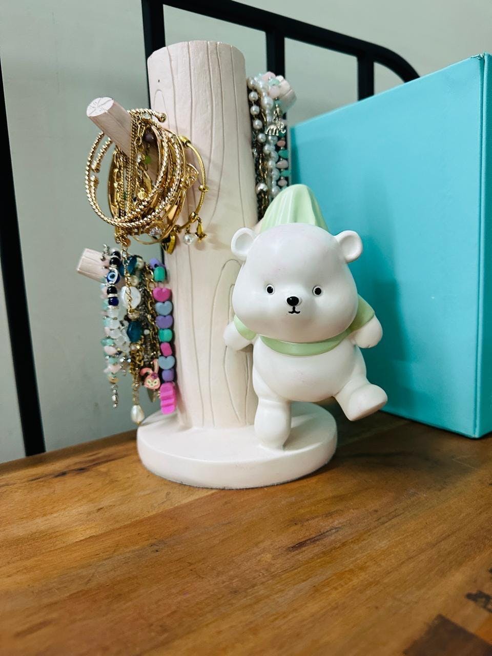 The bear appears to be joyfully clinging to the tree, creating a sense of movement and liveliness. Its light-colored body contrasts nicely with the soft wood tones of the tree, and cloth on its back adds a whimsical touch. This accent piece is perfect for adding a playful yet elegant feel to a nursery, kids’ room, or any space that could use a bit of cheerful decor.