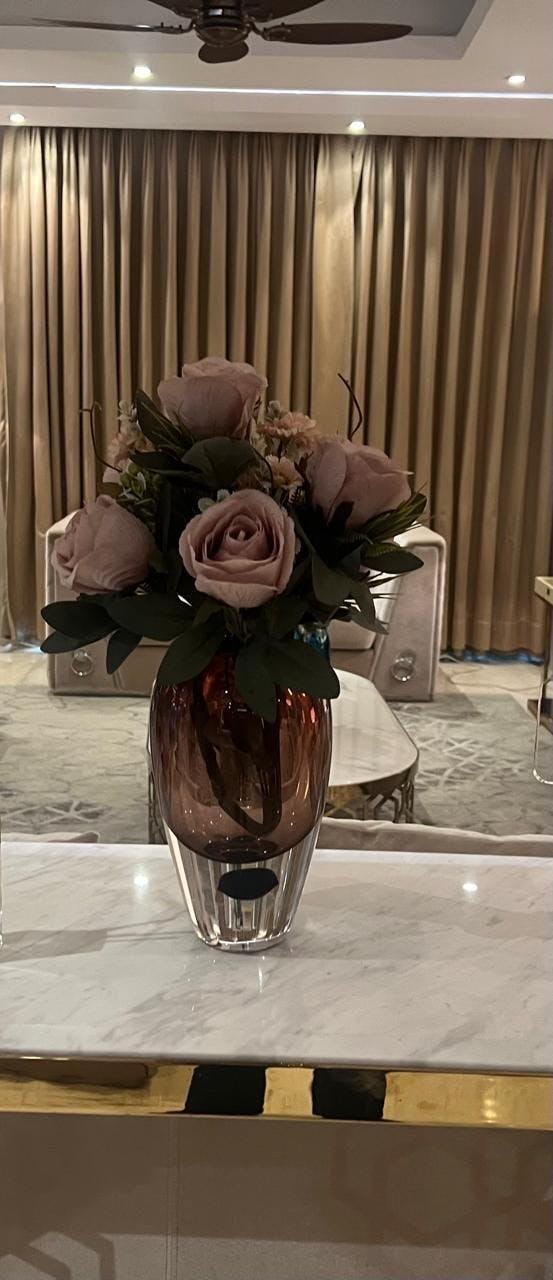 This luxurious vase has a sophisticated, minimalist design, highlighted by its striking color combination and sleek form. The top half of the vase features a rich, translucent amethyst or deep rose hue, gradually transitioning into a clear glass base. The clean, rounded contours and smooth finish give it a modern yet timeless elegance. What sets this vase apart is the deep cobalt blue accent encased within the clear glass at the bottom. This bold, abstract shape adds depth and visual intrigue, drawing attention to the vase’s artistic craftsmanship. The seamless blending of the coloured and clear glass suggests techniques like summers or cased glass, often seen in luxury glassworks. The vase's simplicity, combined with its bold color contrasts, makes it an ideal centrepiece in contemporary or modern interiors.