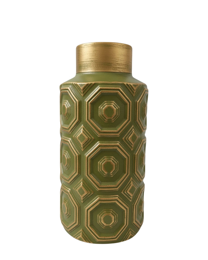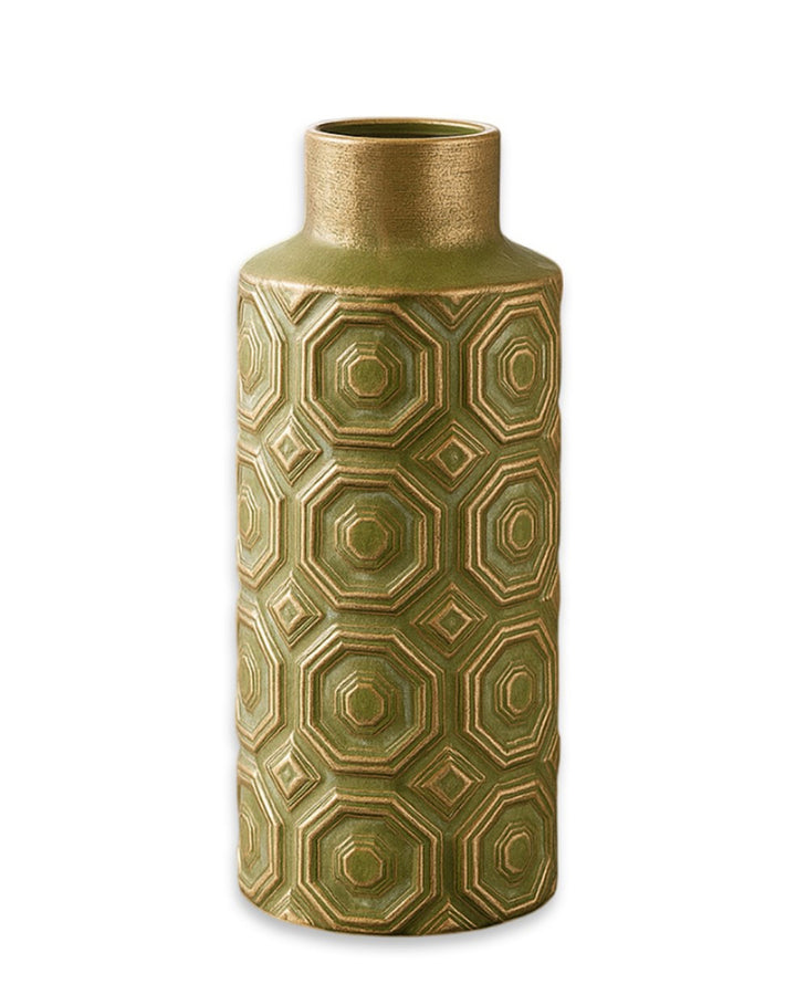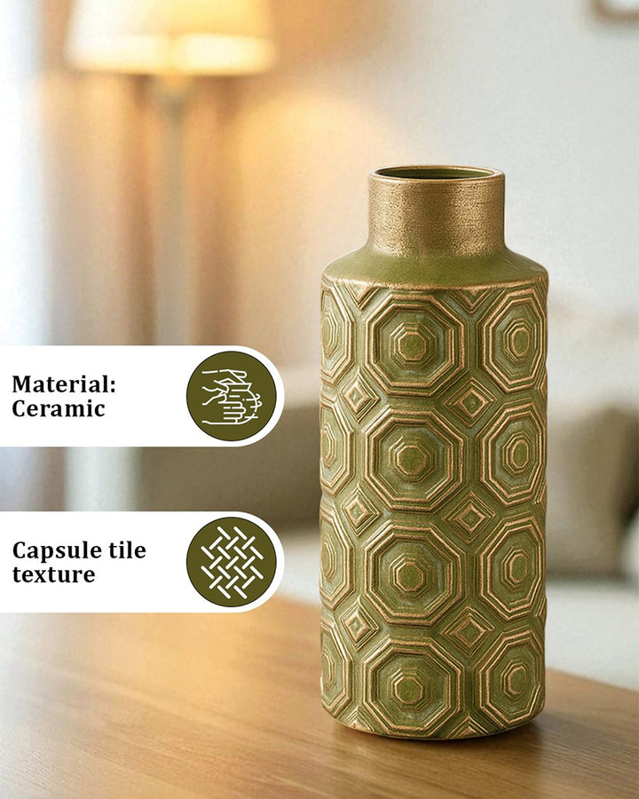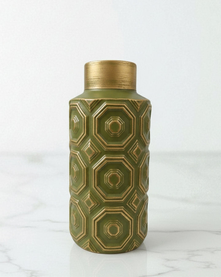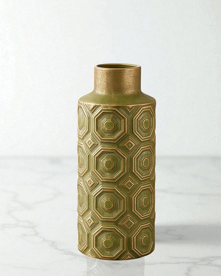 This ceramic vase has a bold, vintage-inspired look with a sturdy cylindrical form and a slightly narrower neck. The surface features a repeating geometric pattern of raised octagonal shapes, giving it a textured, almost architectural quality. These shapes are intricately layered, creating a three-dimensional effect.