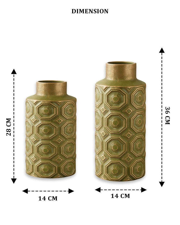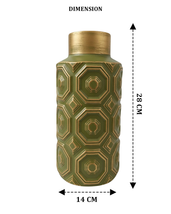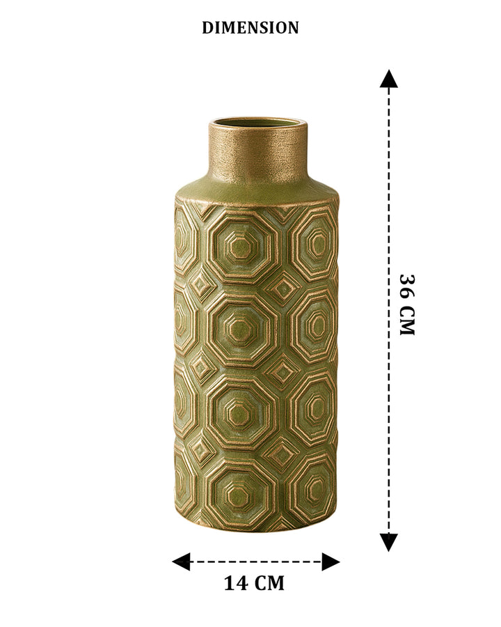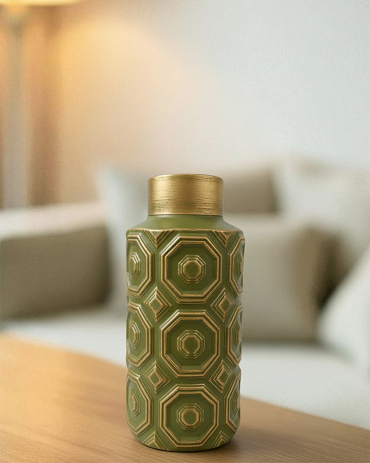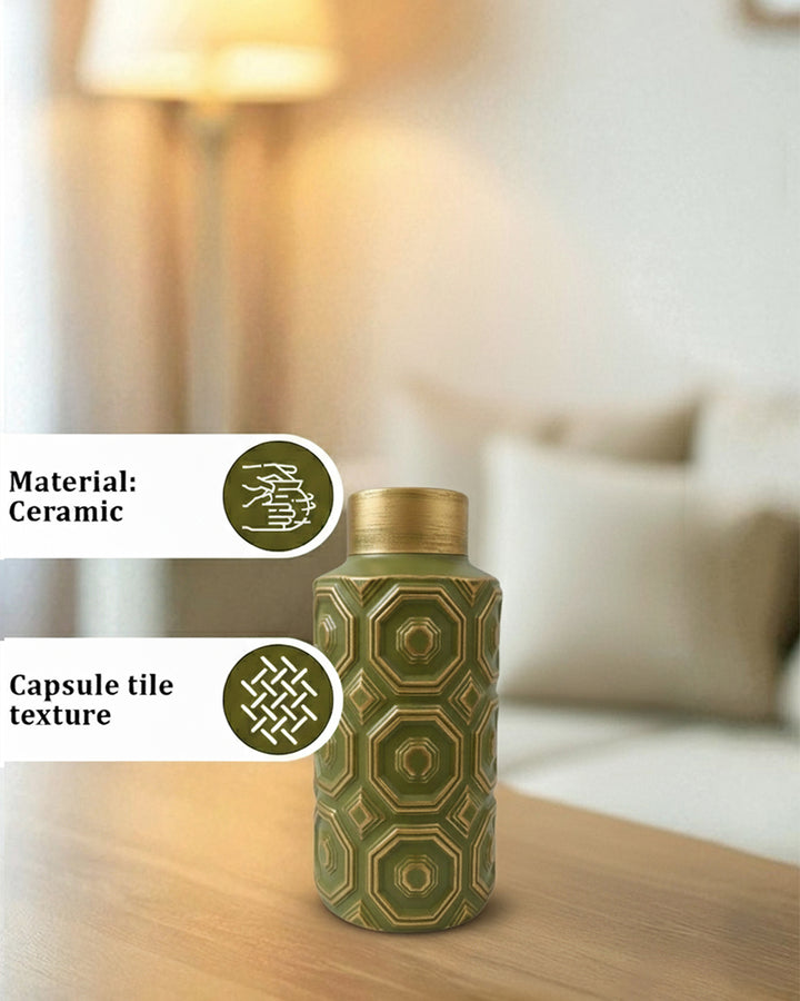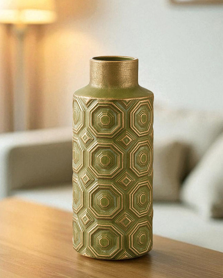 This ceramic vase has a bold, vintage-inspired look with a sturdy cylindrical form and a slightly narrower neck. The surface features a repeating geometric pattern of raised octagonal shapes, giving it a textured, almost architectural quality. These shapes are intricately layered, creating a three-dimensional effect.