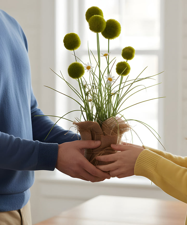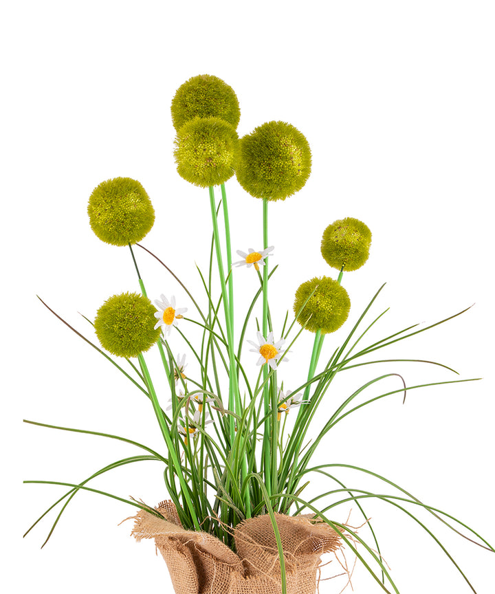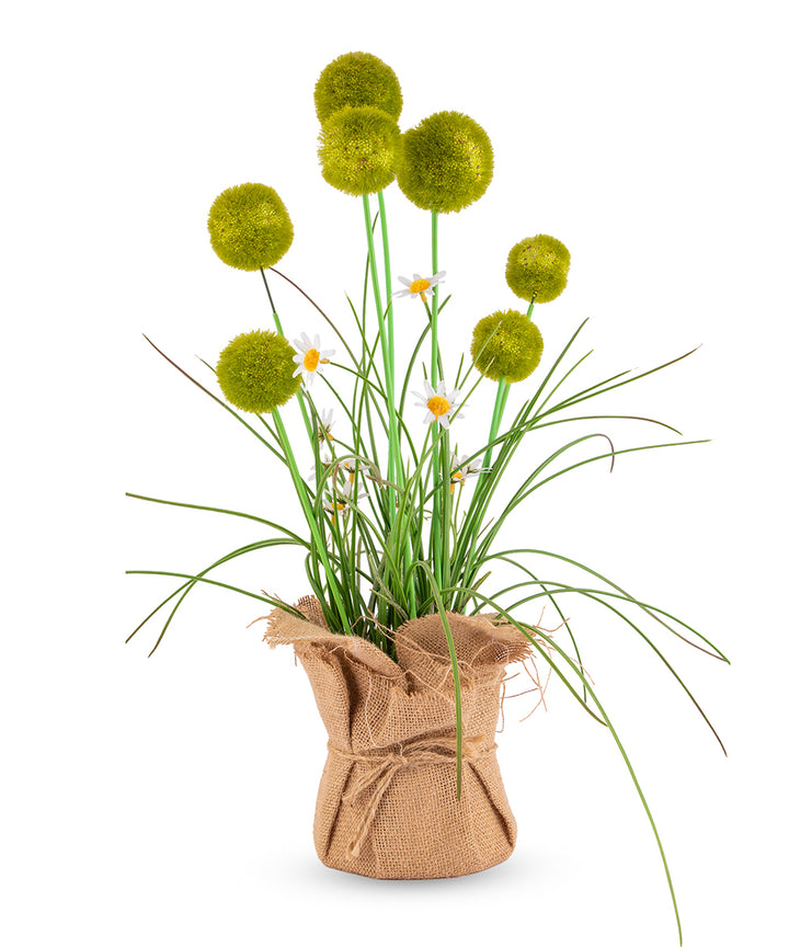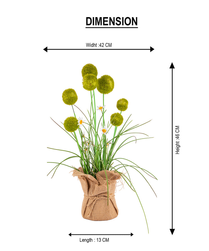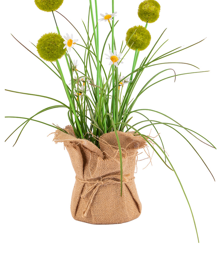Chic artificial Dandelion and yellow Daisy bouquet in a jute-wrapped pot. Crafted with silk, plastic, and jute for a fresh look—perfect for stylish décor all year round. Perfect for adding a touch of freshness and charm, these pots can be placed anywhere — in your living room, balcony, office desk, garden area, bathroom or entrance.