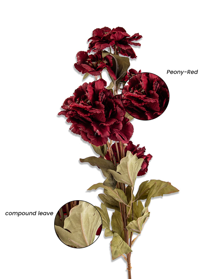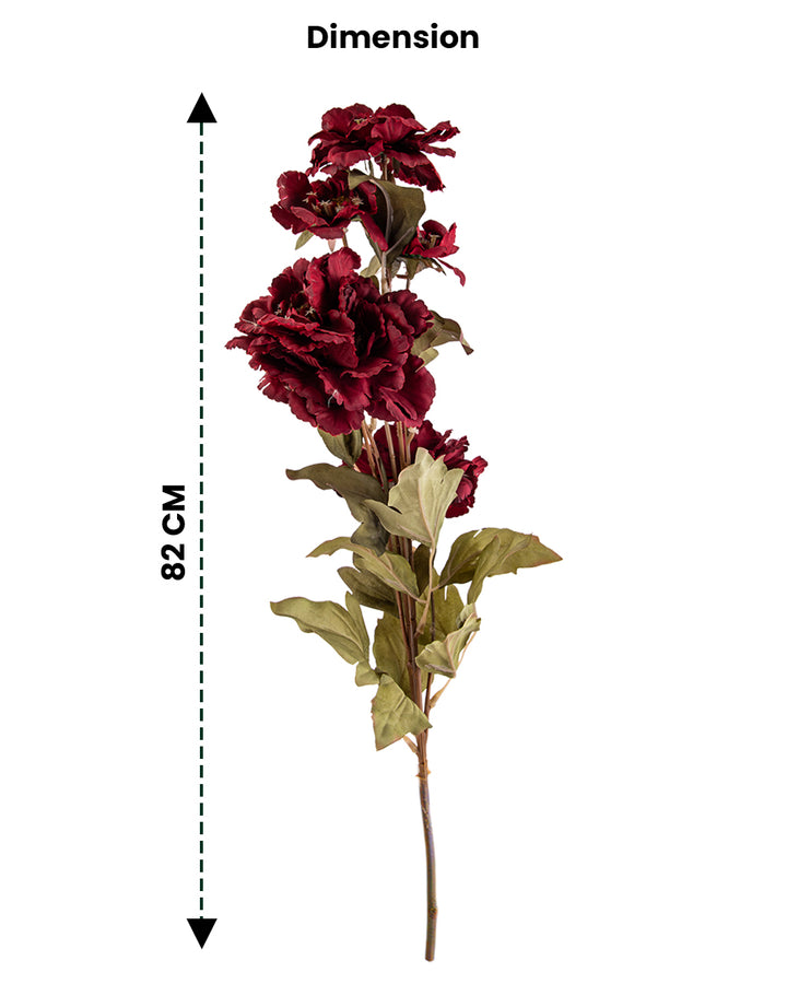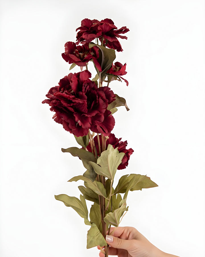 These luxurious faux flowers feature deep red petals with rich, velvety tones that evoke drama and elegance. Each bloom is layered with intricate ruffles, creating a sense of fullness and movement. The deep red hue is bold yet romantic, enhanced by soft olive-green leaves and realistic stems. This bouquet brings a sense of timeless sophistication to any interior — perfect for moody, classic, or contemporary spaces.