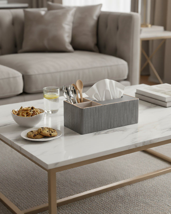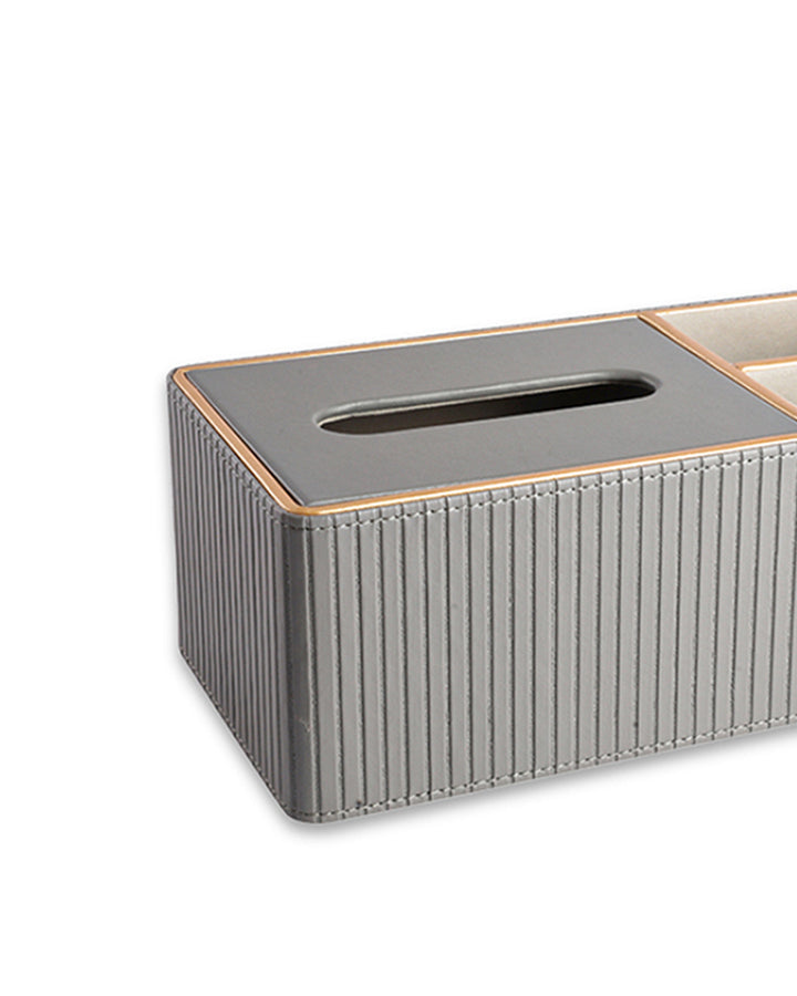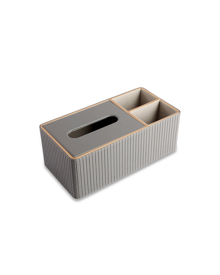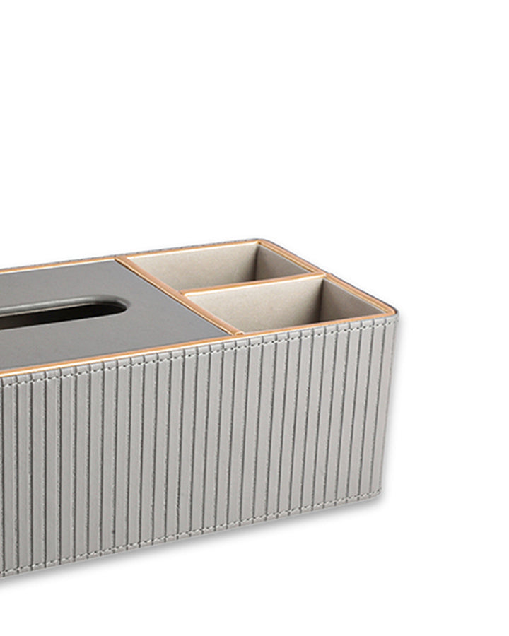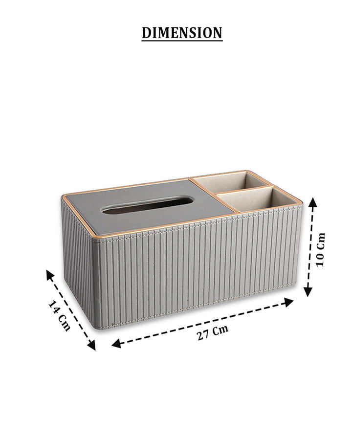 Elevate your space with the a premium faux leather organizer designed to combine functionality and style. This elegant and practical organizer combines a tissue dispenser with built-in storage compartments. The main slot at the top allows easy access to tissues, while the two side compartments are perfect for storing remote controls, pens, cosmetics, keys, or other small daily essentials. The high-quality faux leather finish exudes luxury, durability, and easy maintenance, making it the perfect blend of practicality and sophistication.