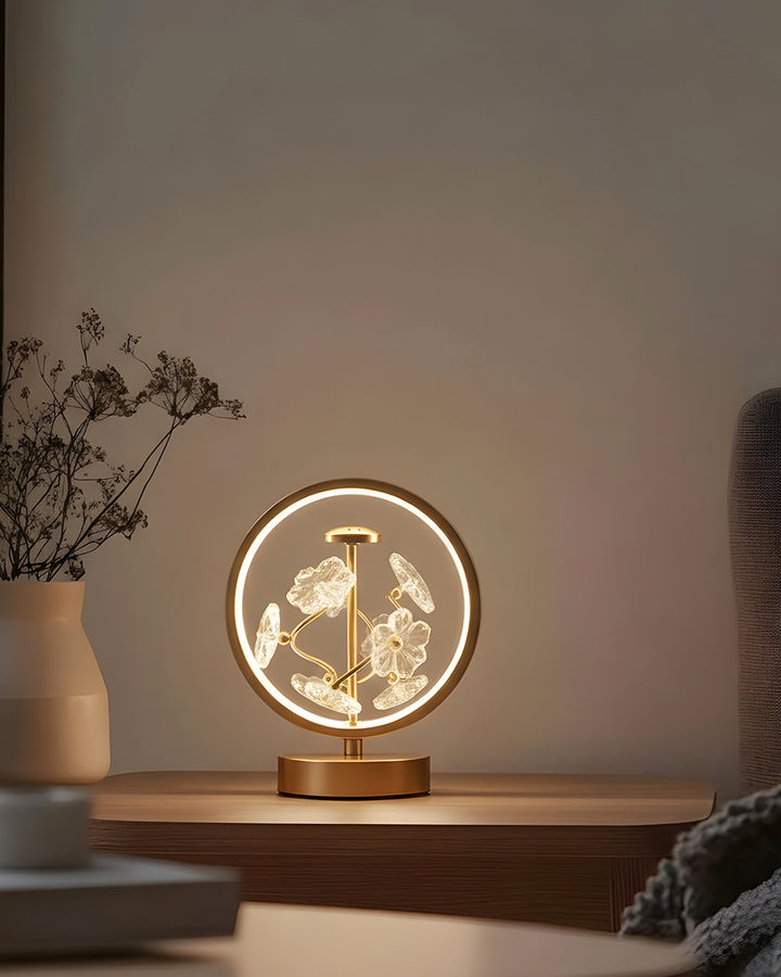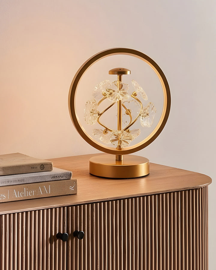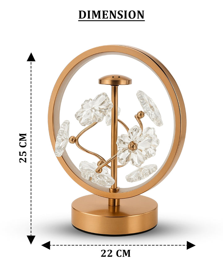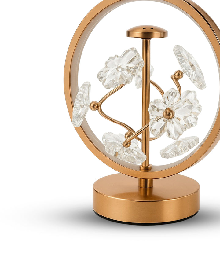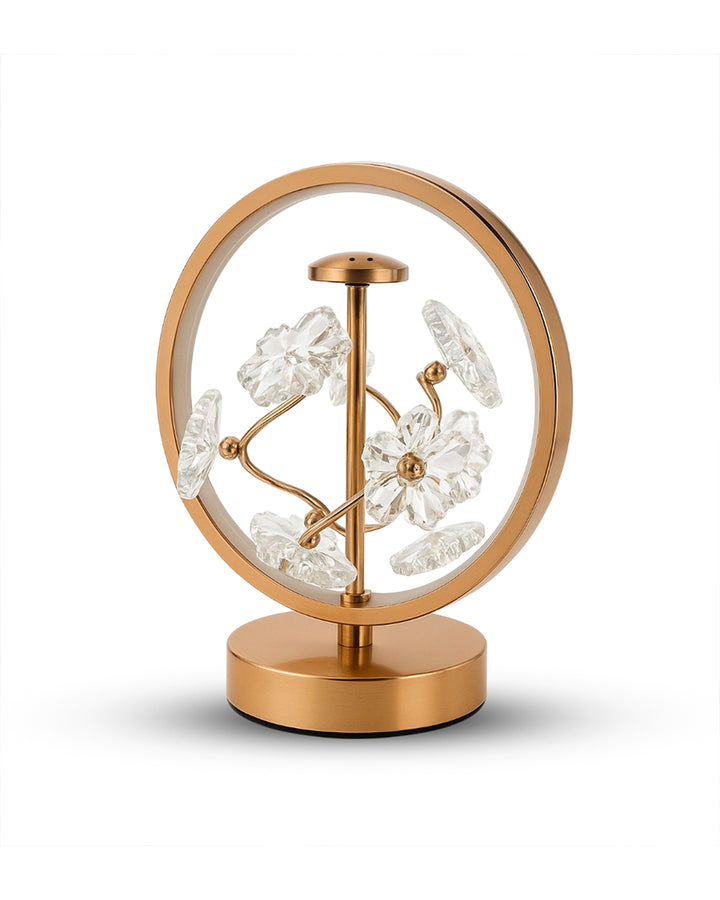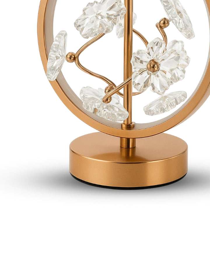 This is a modern crystal LED table lamp with a luxurious and artistic design. The lamp features a circular frame in a polished gold finish, giving it a sleek and elegant appearance. Inside the circle, a geometric structure made of golden metallic rods supports a Centrepiece adorned with clear, faceted crystal accents.