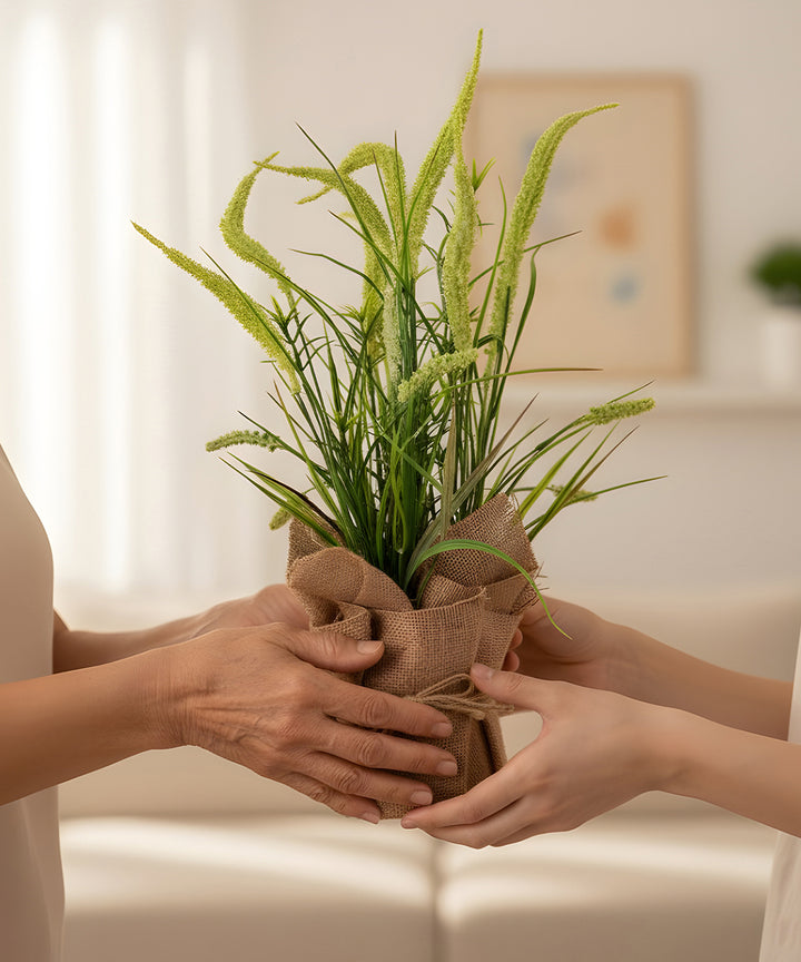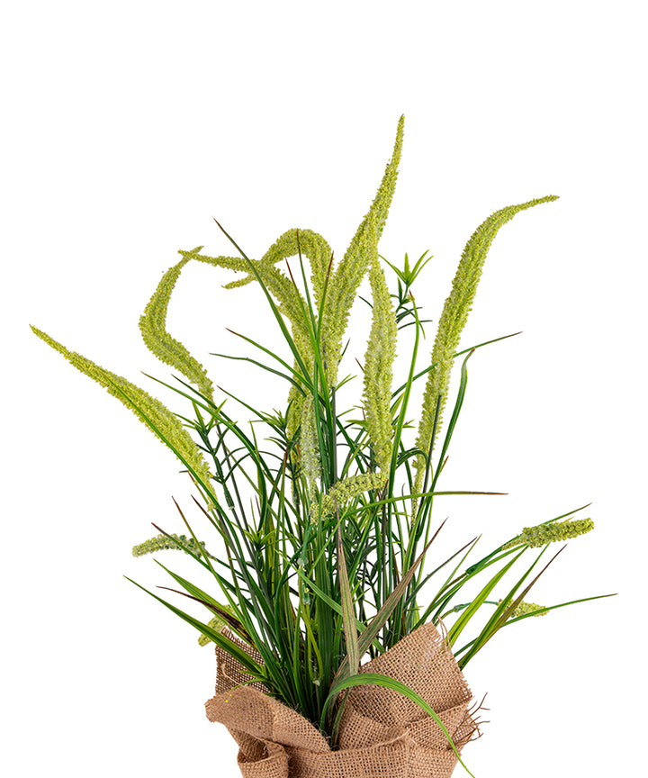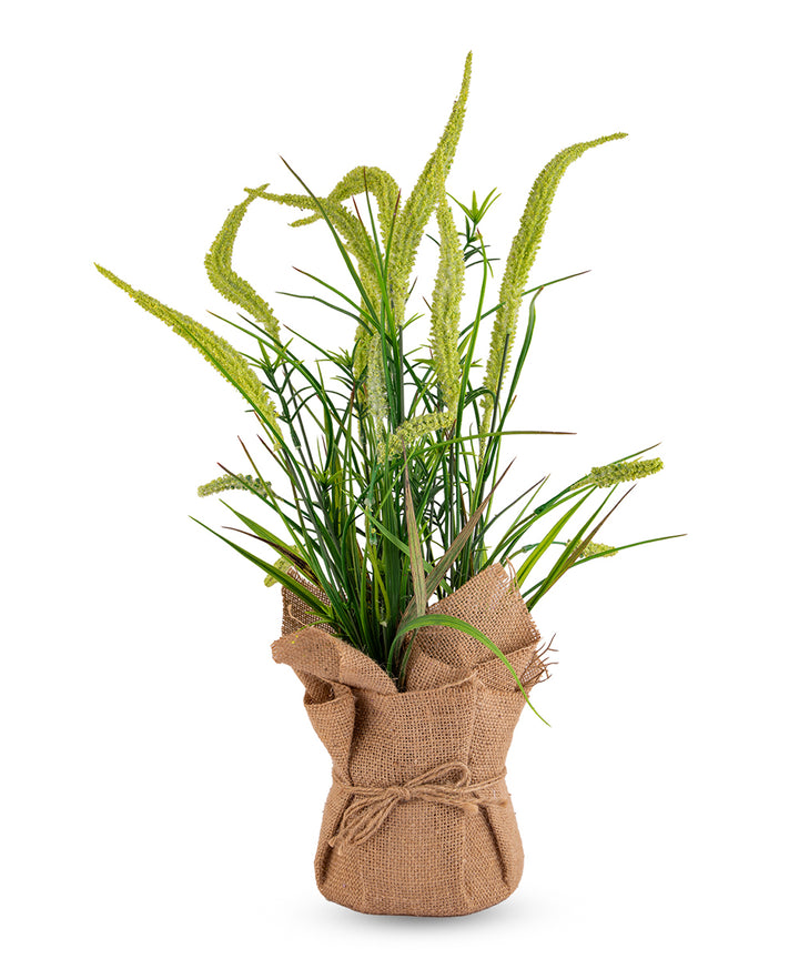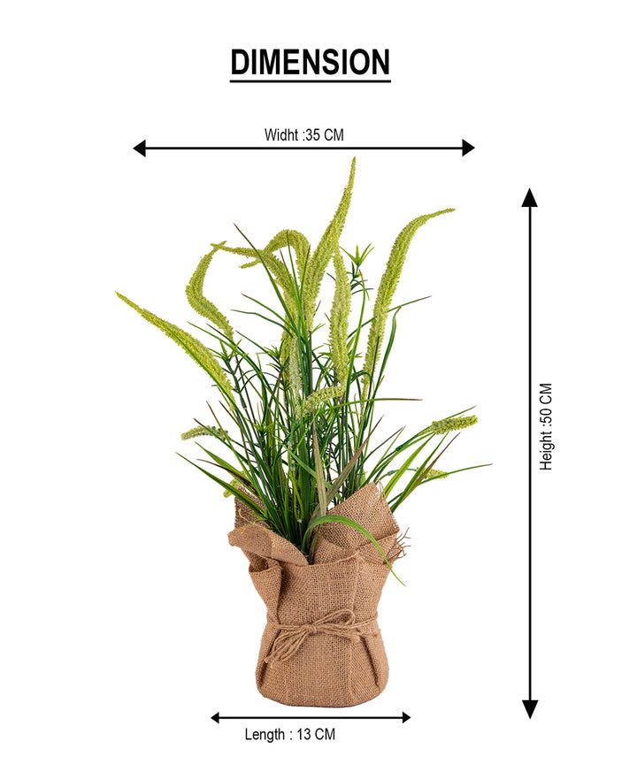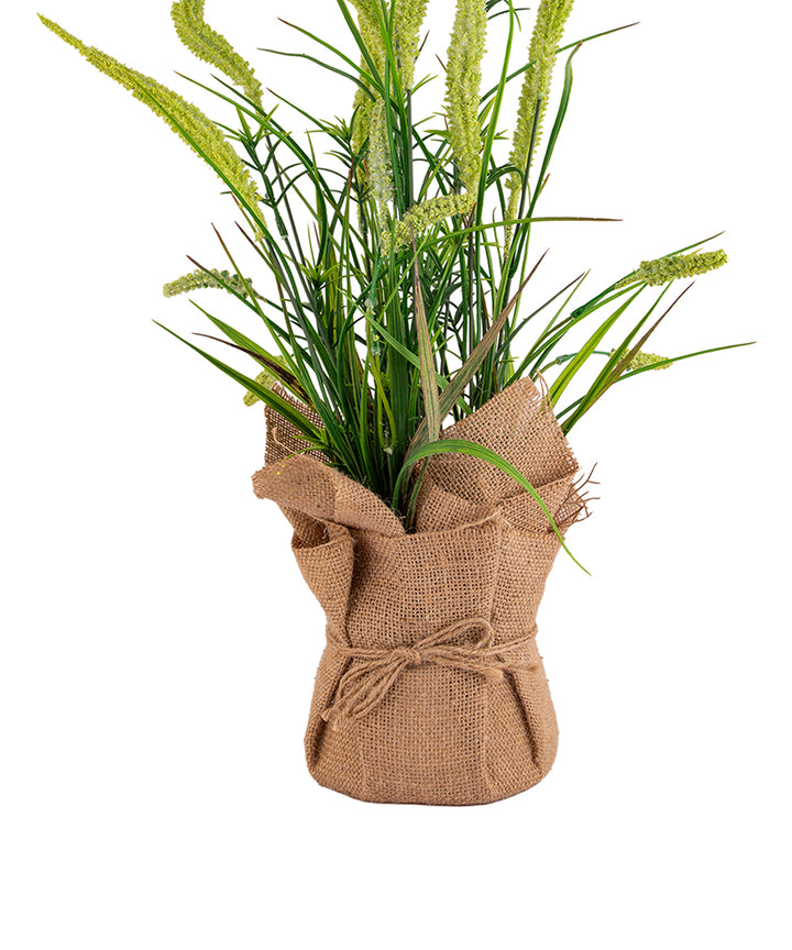 Charming artificial Foxtail Grass and Daisy in a burlap-wrapped pot. Made of silk, plastic, and natural jute, ideal for adding rustic elegance to home or office decor. Perfect for adding a touch of freshness and charm, these pots can be placed anywhere — in your living room, balcony, office desk, garden area, bathroom or entrance.