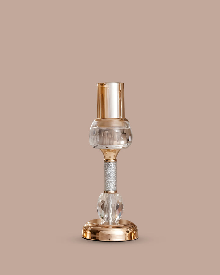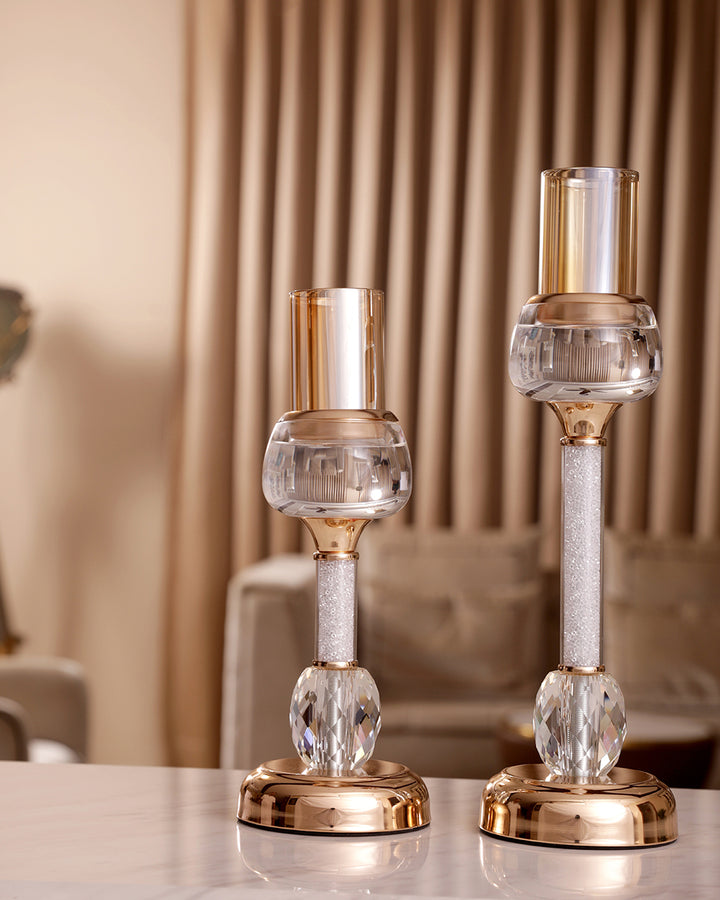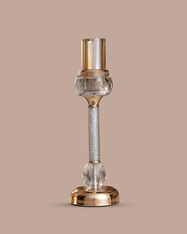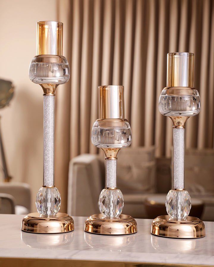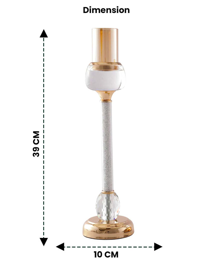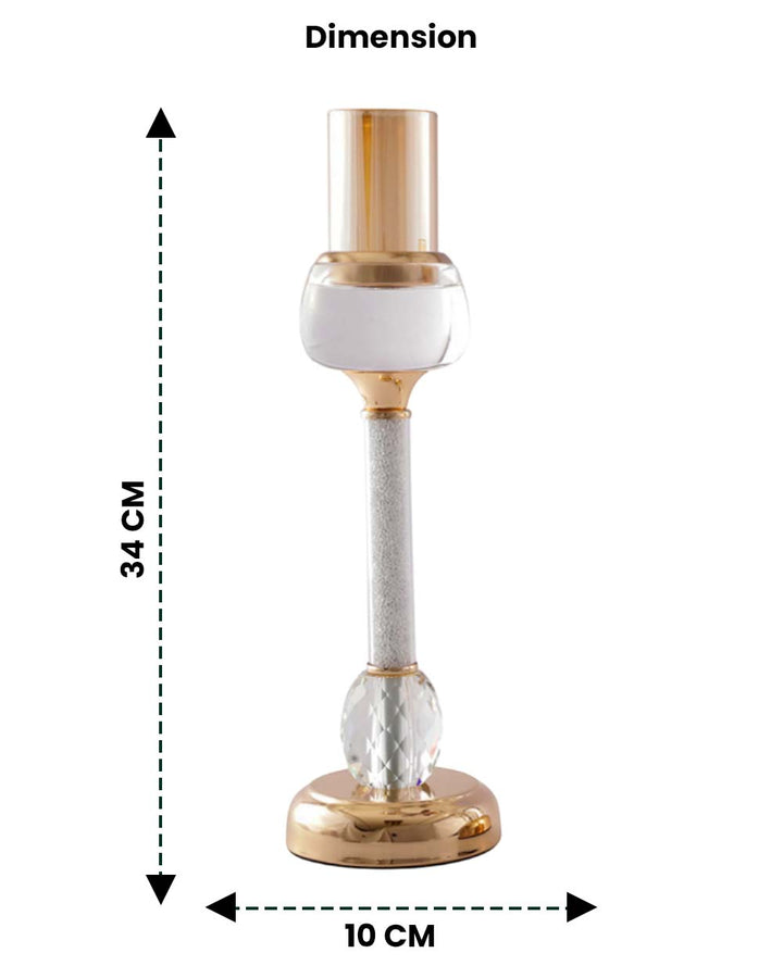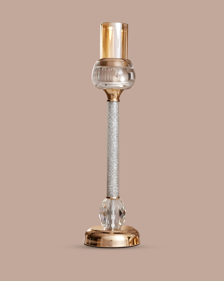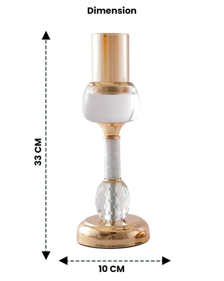 This candle stand is a striking and elegant decorative piece, blending glass, crystal, and metal elements to create a luxurious look.