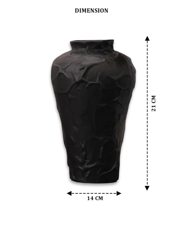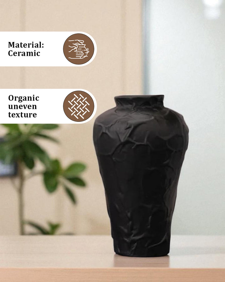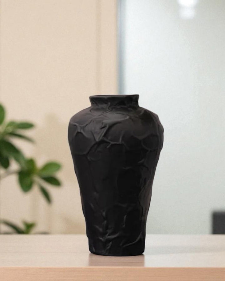 This black ceramic vase, with its abstract and sculptural form, adds an avant-garde aesthetic to any space. Perfect for modern or minimalist interiors, it stands out as both a functional vase and an art piece, offering a striking visual statement.