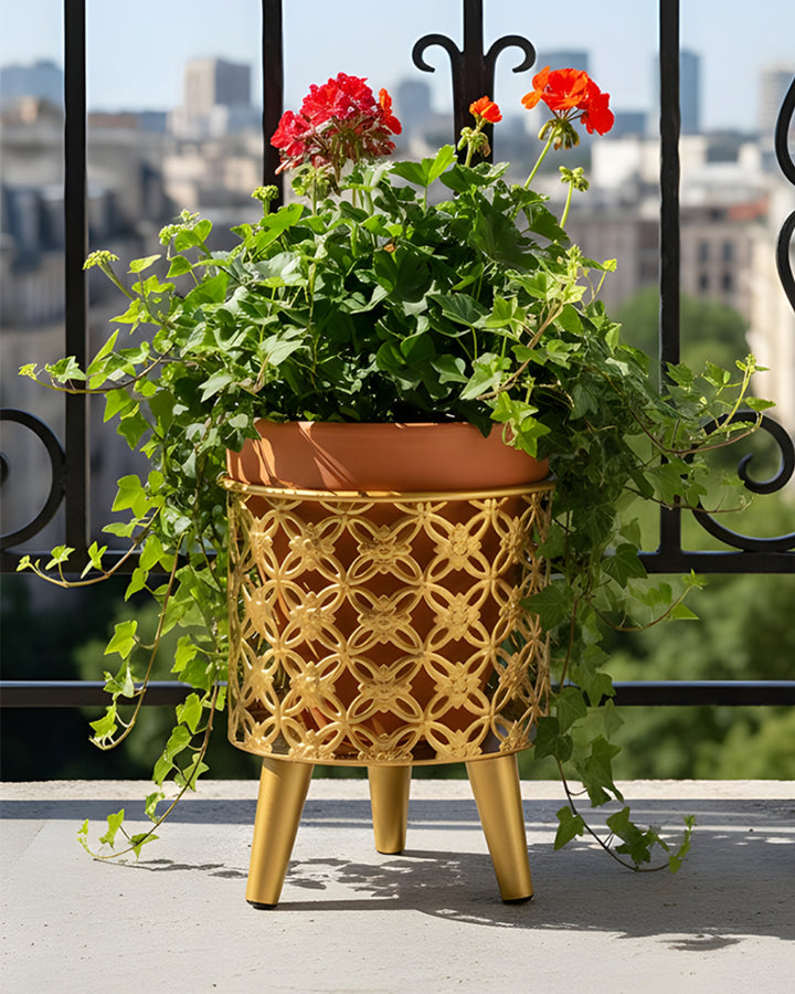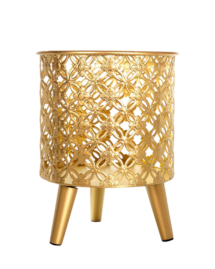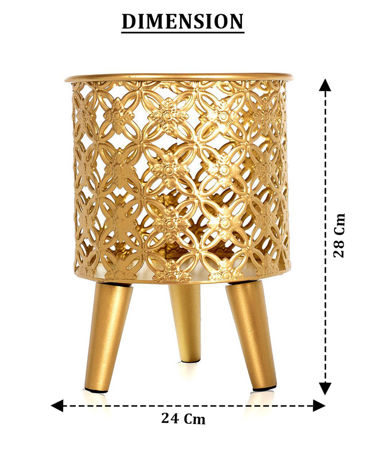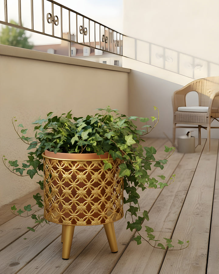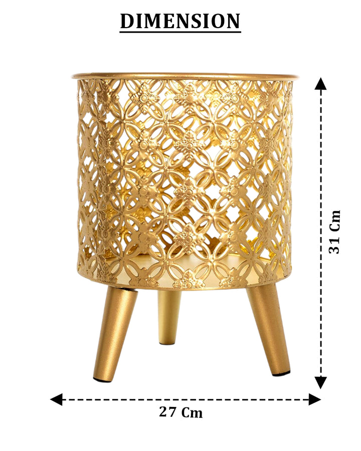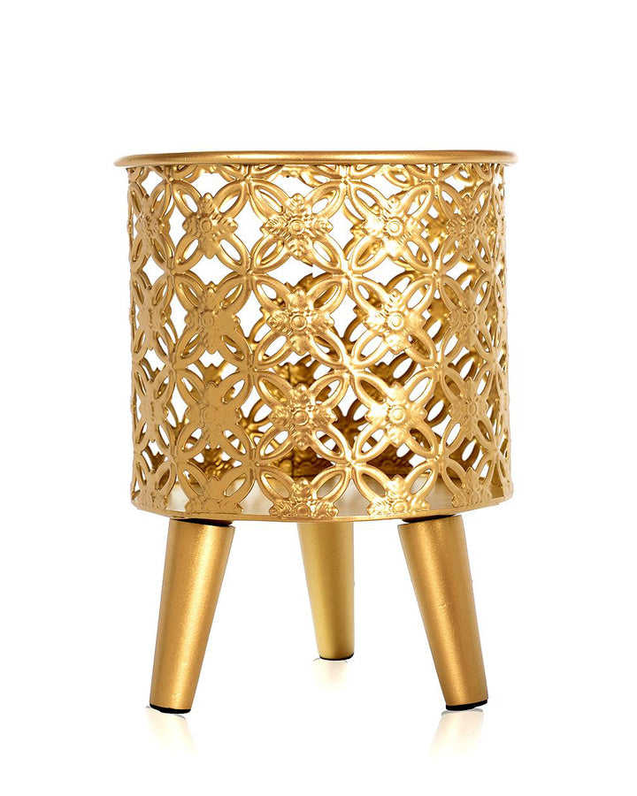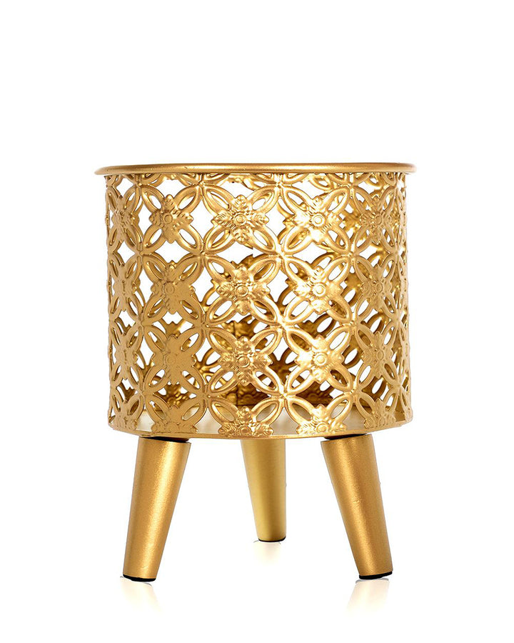 This is an elegant, gold-coloured metal planter with an intricate lattice pattern featuring floral-inspired cut-outs. It is raised on three sleek, gold-finished legs, giving it a modern yet vintage aesthetic. The openwork design allows light to pass through, creating a stunning visual effect. This planter is ideal for both contemporary and classic interiors, adding a touch of luxury to any space.