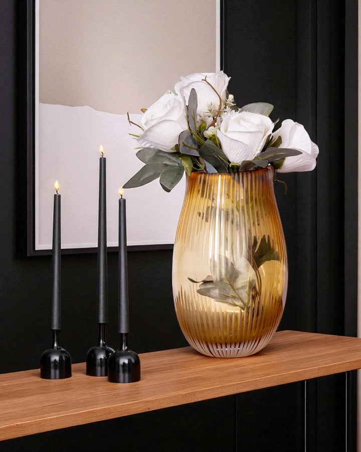 This golden yellow luxe glass vase radiates opulence with its luminous, translucent glow. Its rich golden hues mimic the warmth of molten amber, seamlessly blending timeless elegance with contemporary design. Whether as a standalone statement piece or an accent for floral arrangements, this vase exudes sophistication, making it the perfect centrepiece for refined interiors. Crafted with precision, its smooth curves and radiant finish create a mesmerizing play of light, adding an air of grandeur to any space.