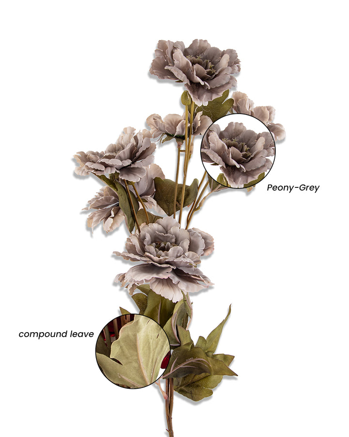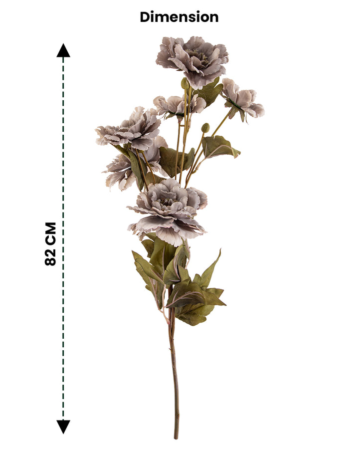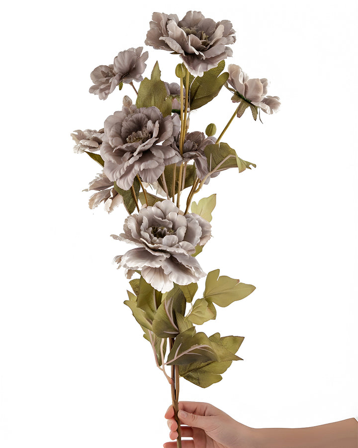 These luxurious faux flowers feature deep grey petals with rich, velvety tones that evoke drama and elegance. Each bloom is layered with intricate ruffles, creating a sense of fullness and movement. The grey red hue is bold yet romantic, enhanced by soft olive-green leaves and realistic stems. This bouquet brings a sense of timeless sophistication to any interior — perfect for moody, classic, or contemporary spaces.