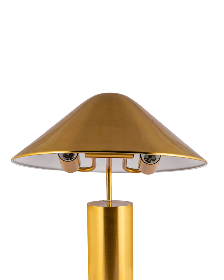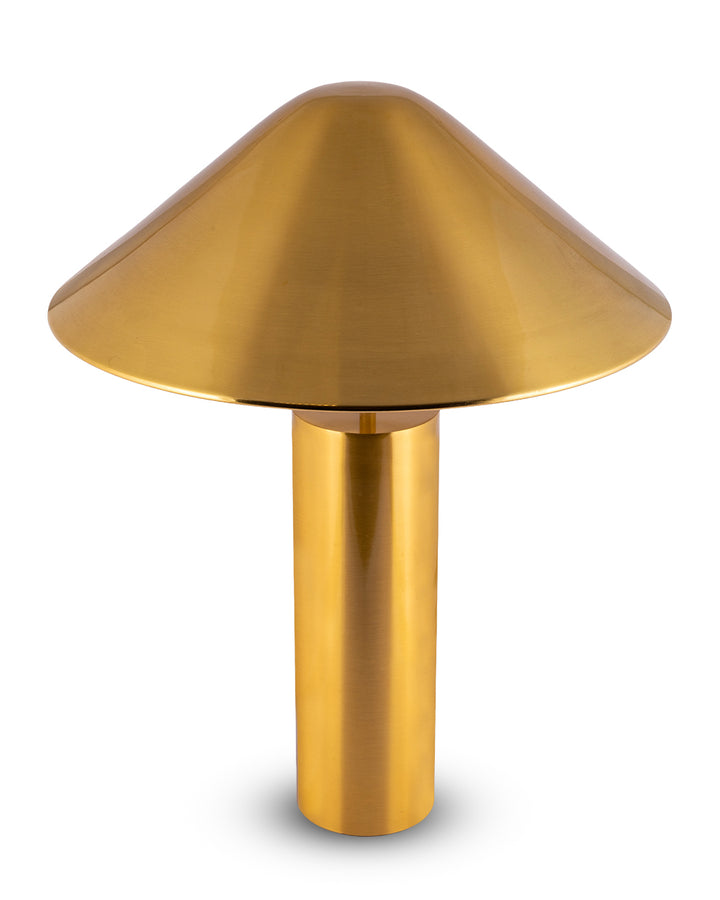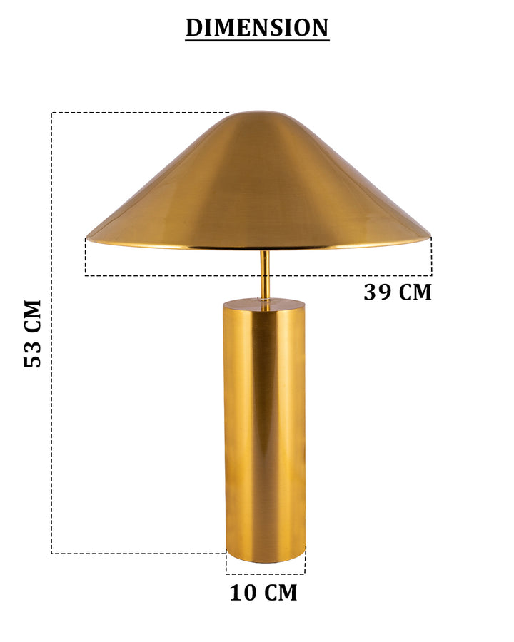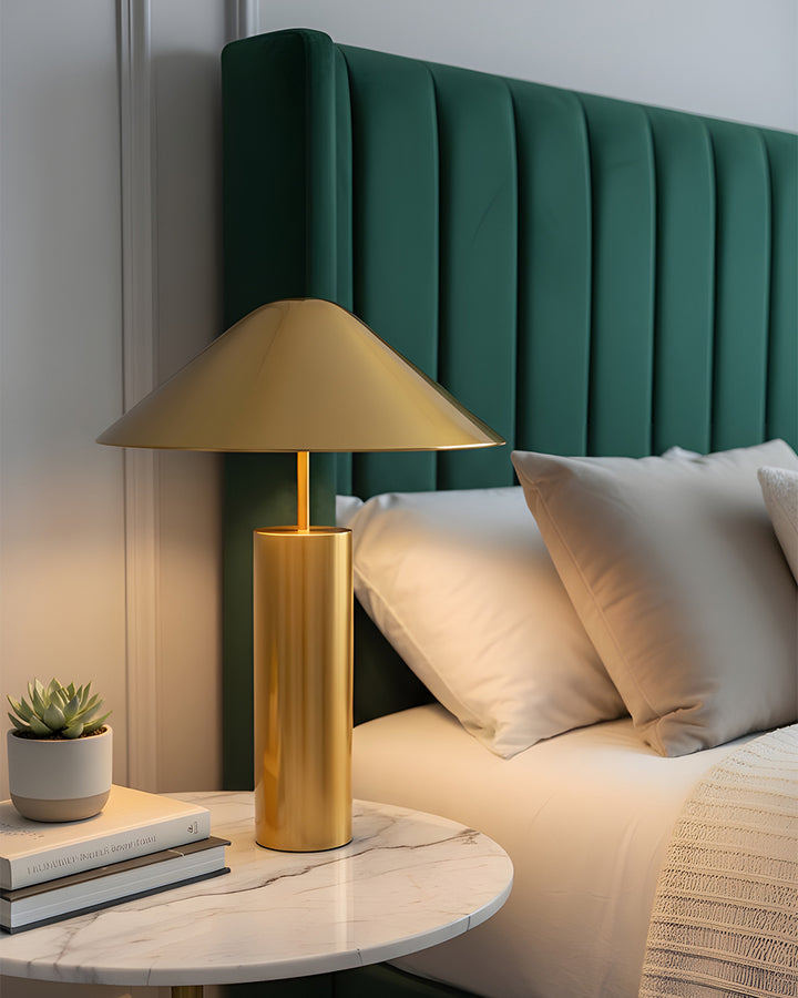 This statement table lamp showcases a sleek, cylindrical base and a dramatic, wide-brimmed metallic shade—an icon of modern luxury and sophisticated design.