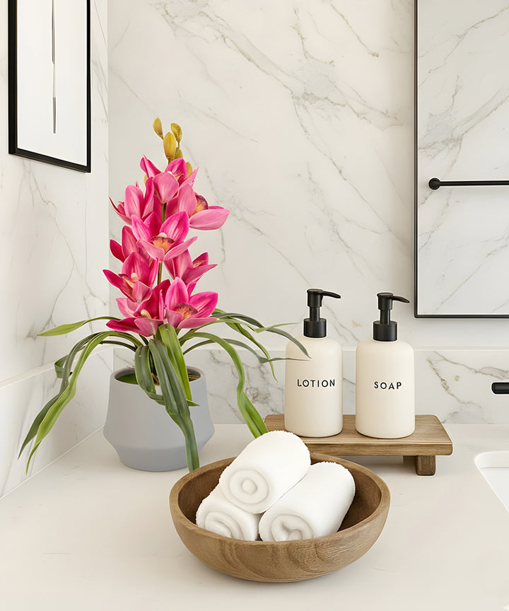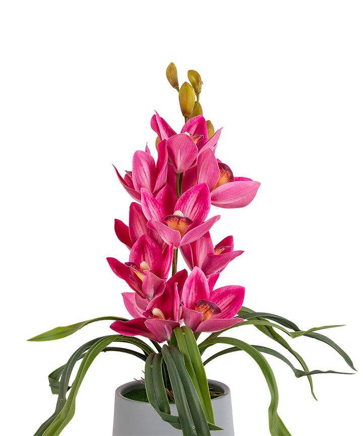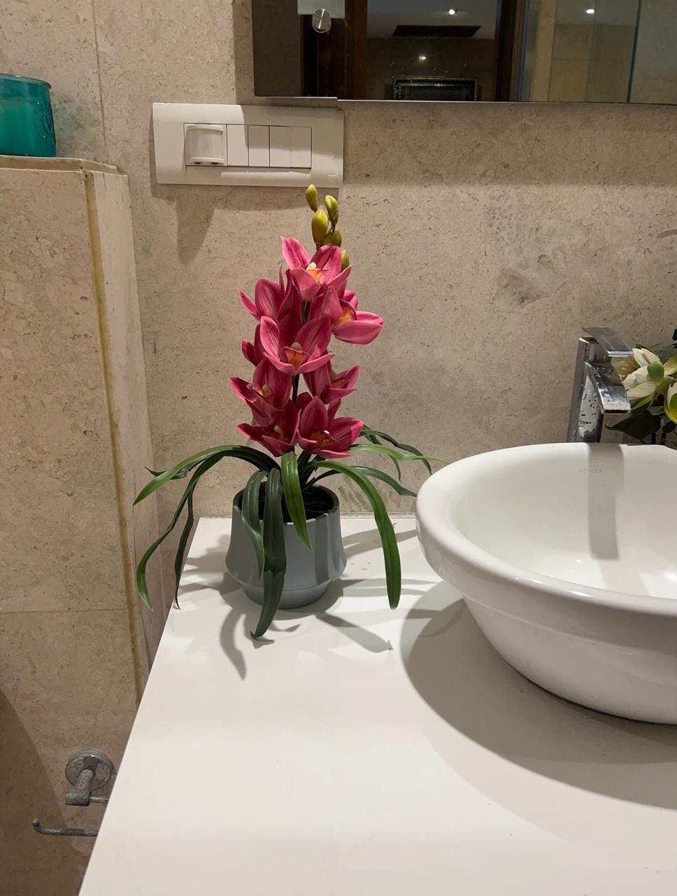 This unique arrangement of vertical lush faux jewel orchids with cascading leaves and a modern ceramic gray is perfect for adding a touch of colour in your decor. These pots can be placed anywhere — in your living room, balcony, office desk, garden area, bathroom or entrance.