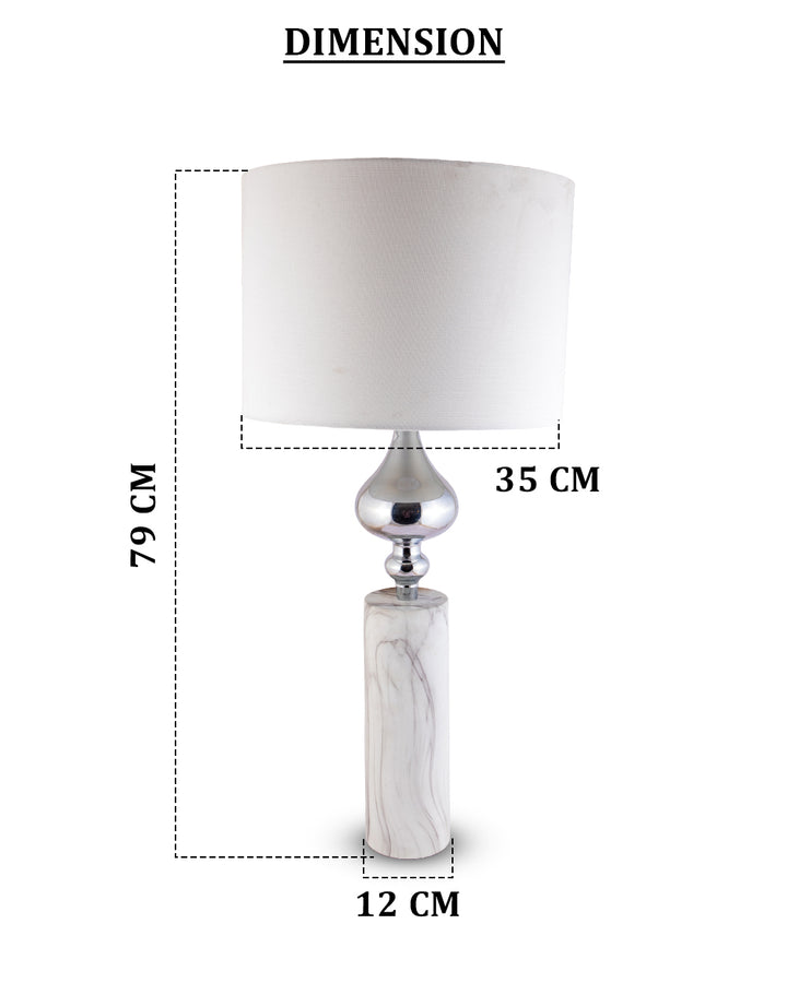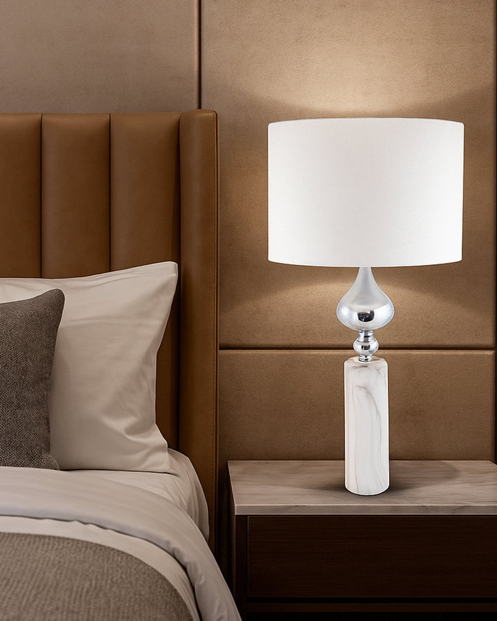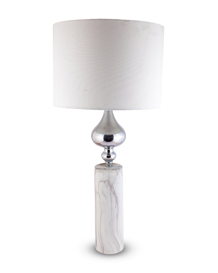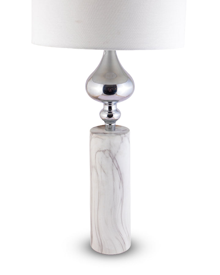 The Marble Elegance Lamp combines a sleek cylindrical marble base with a polished chrome accent and soft fabric shade, bringing timeless sophistication and modern charm to any space.