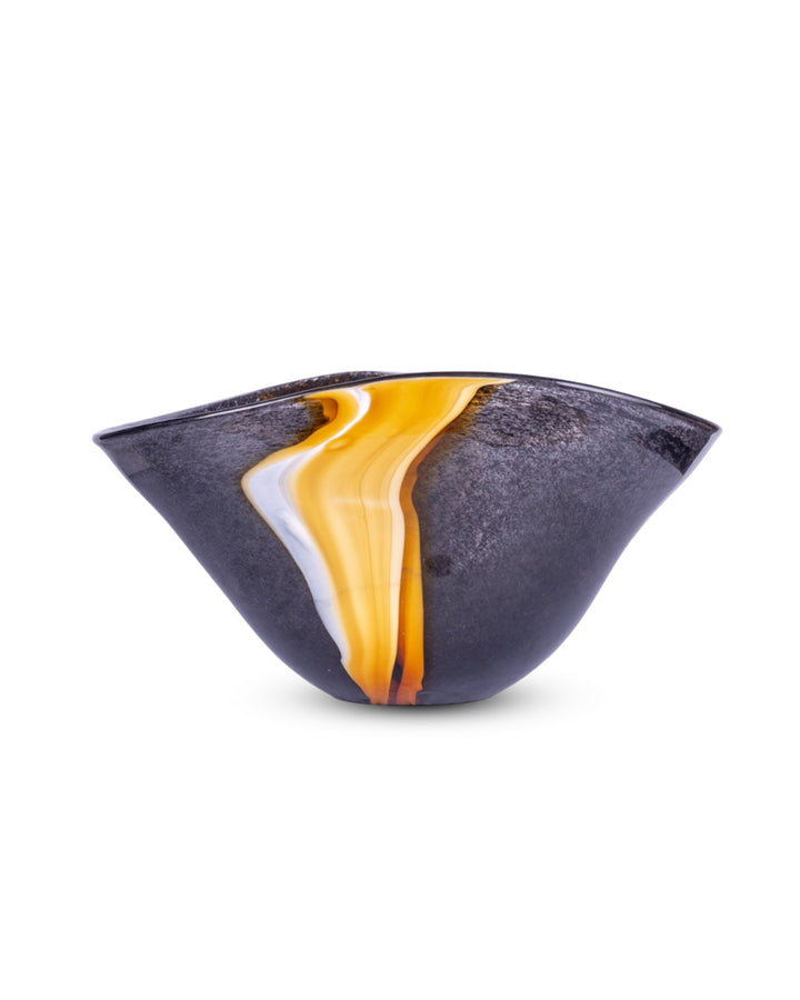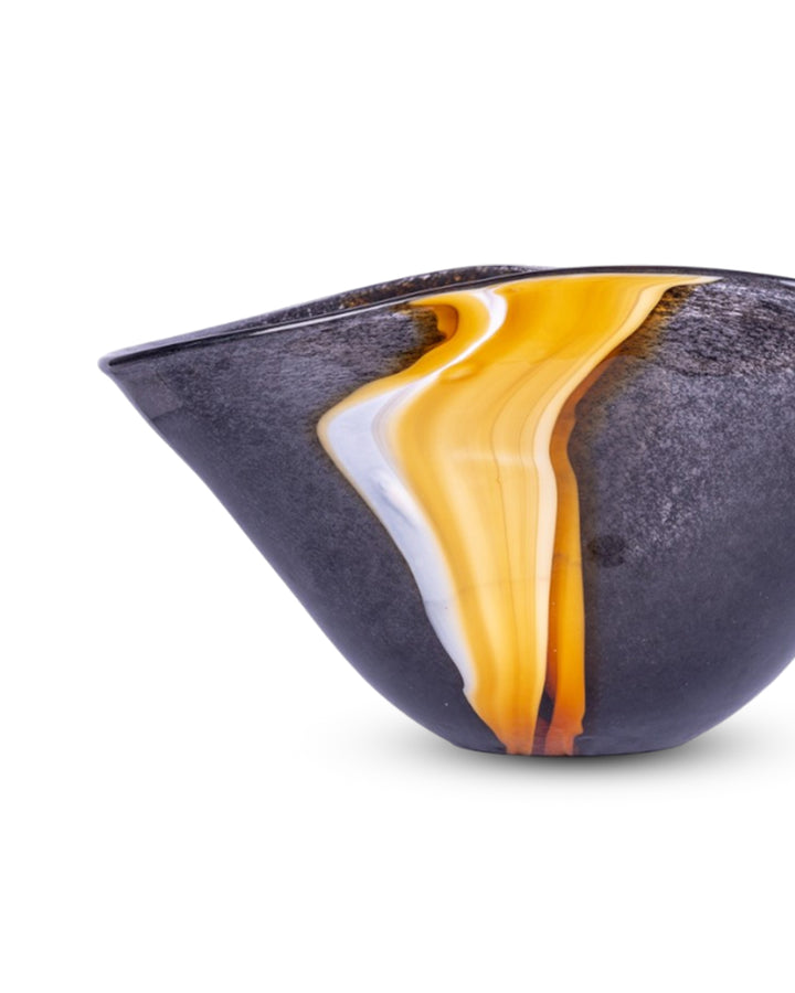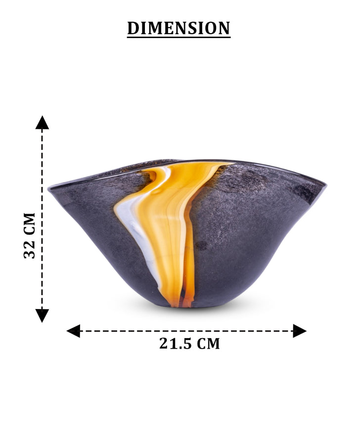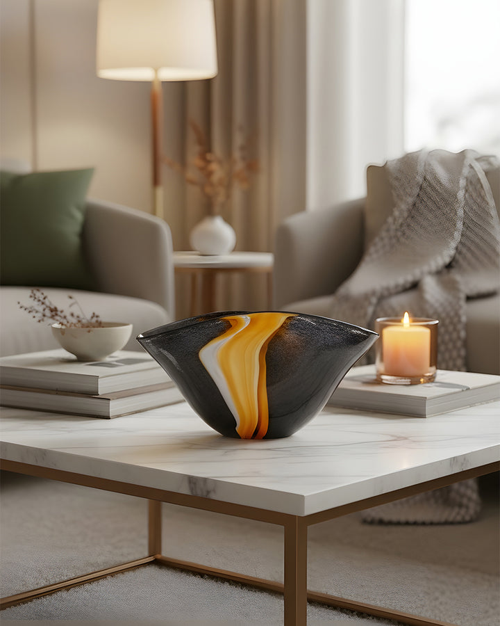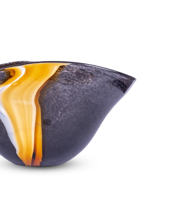 This striking statement piece features a bold, deep black glass body that exudes modern sophistication. Running gracefully along its surface is a single, elegant vertical wave rendered in a luminous yellow-gold hue. The contrast between the dark, reflective glass and the radiant wave creates an eye-catching balance of drama and refinement. Perfect for contemporary interiors, the Eclipse Wave Vase serves as both a functional vessel and a work of art, effortlessly enhancing any space with its unique blend of minimalist design and luxurious detail.