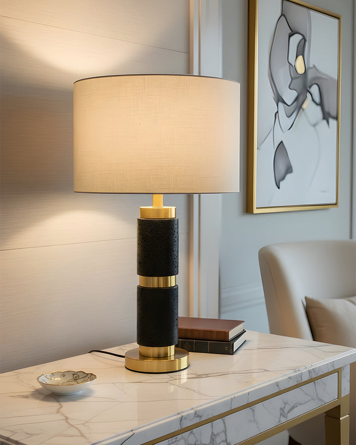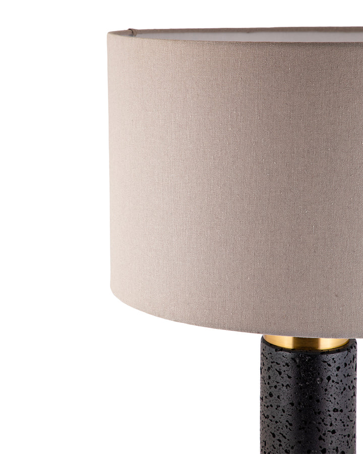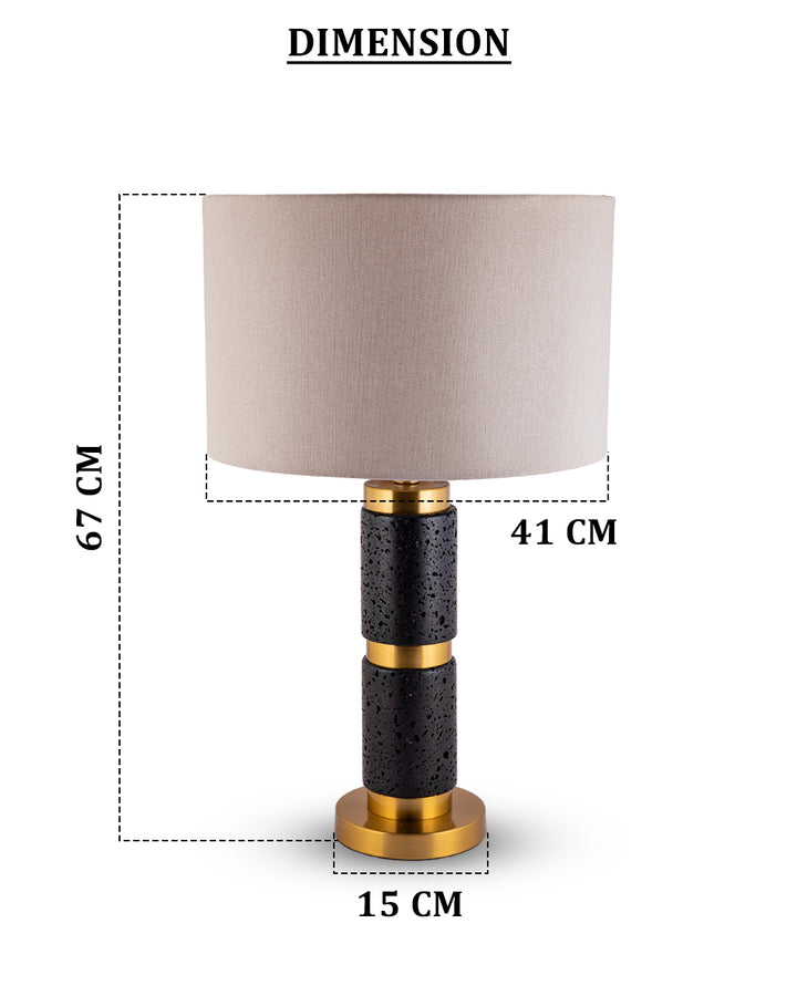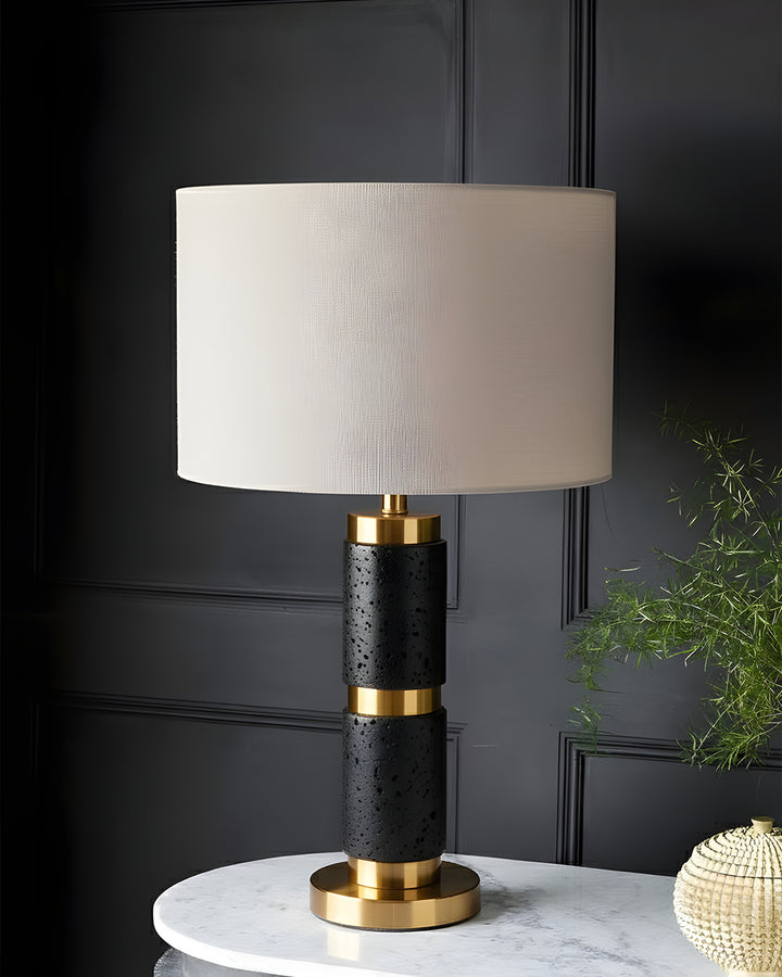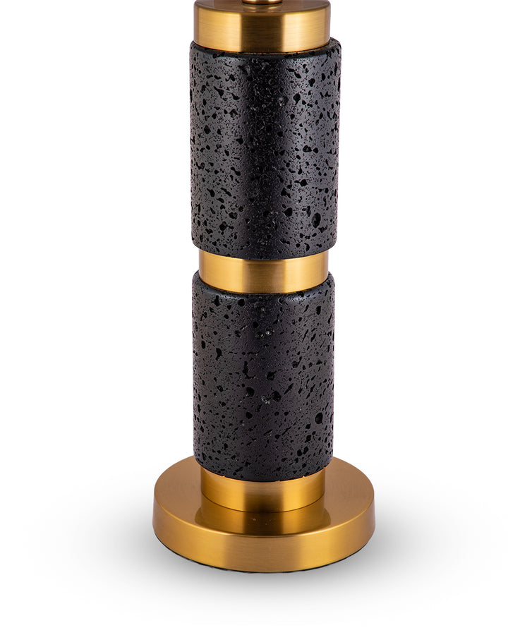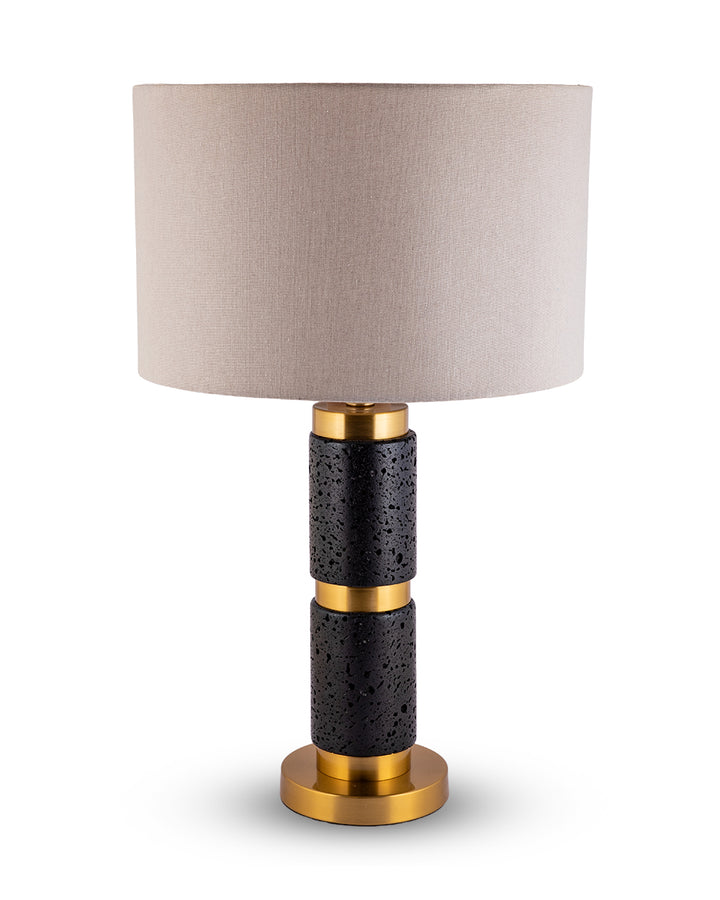This striking lamp exudes luxury with a sleek taupe shade atop a bold base of black textured cylinders stone and radiant gold accents, merging modern elegance with opulent style.
