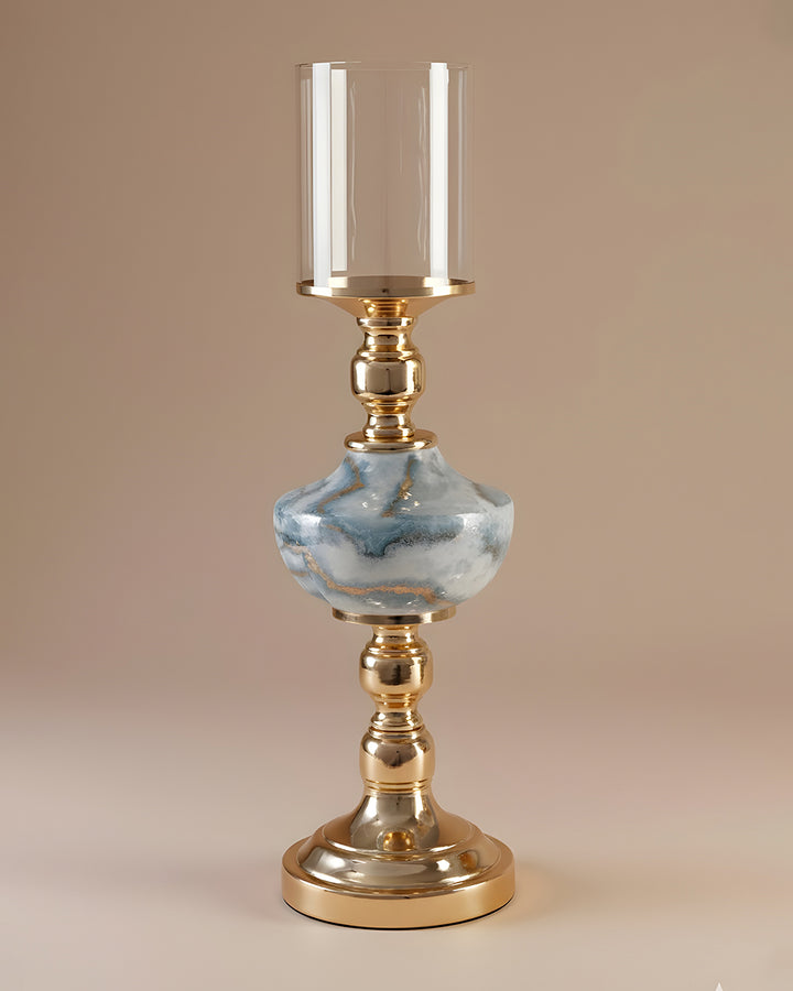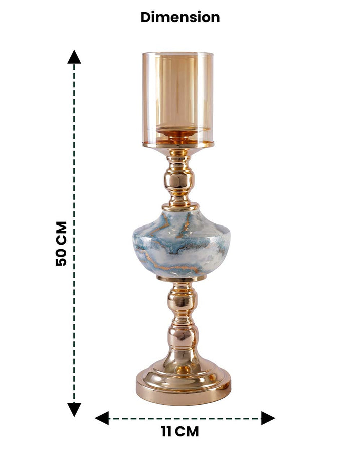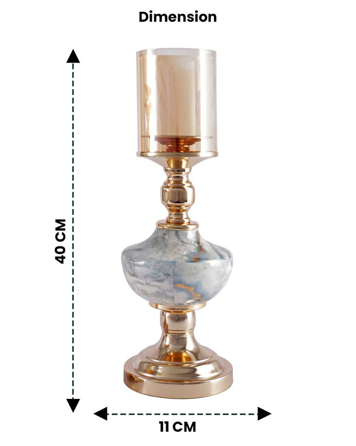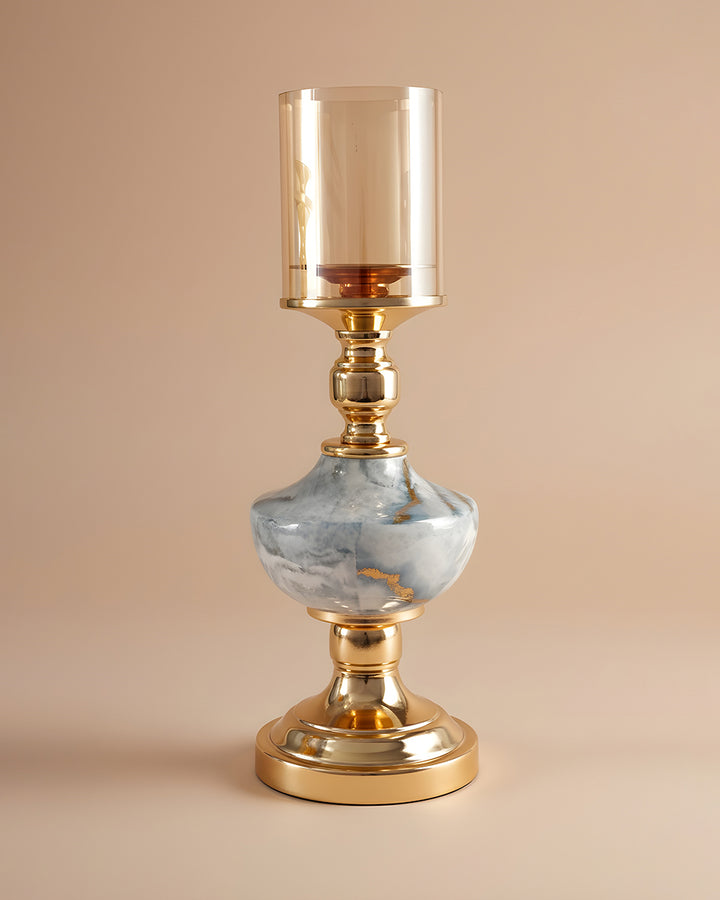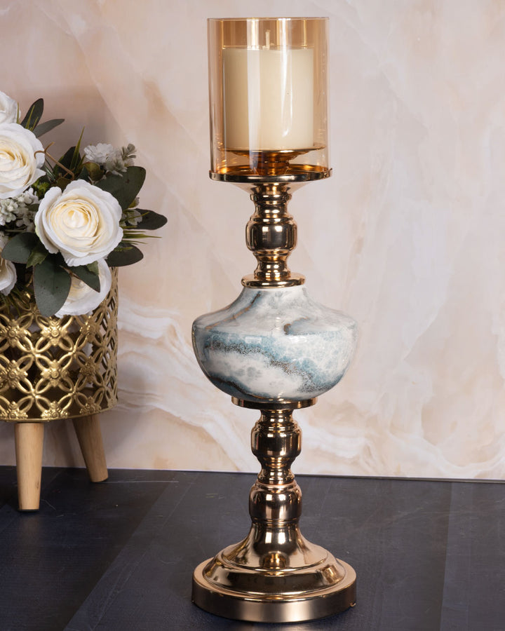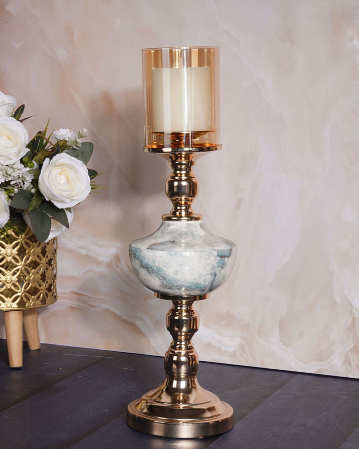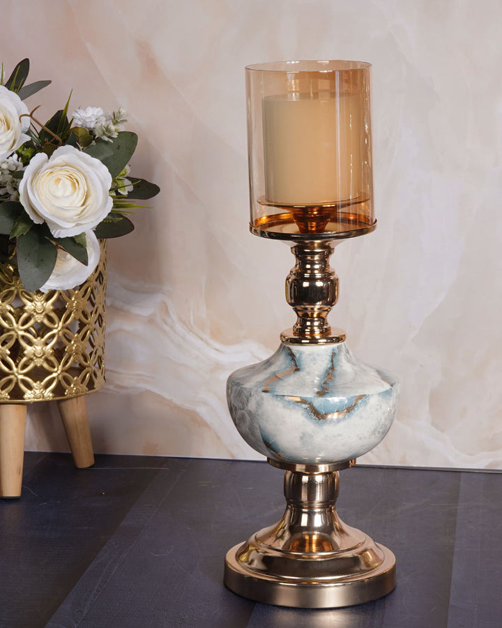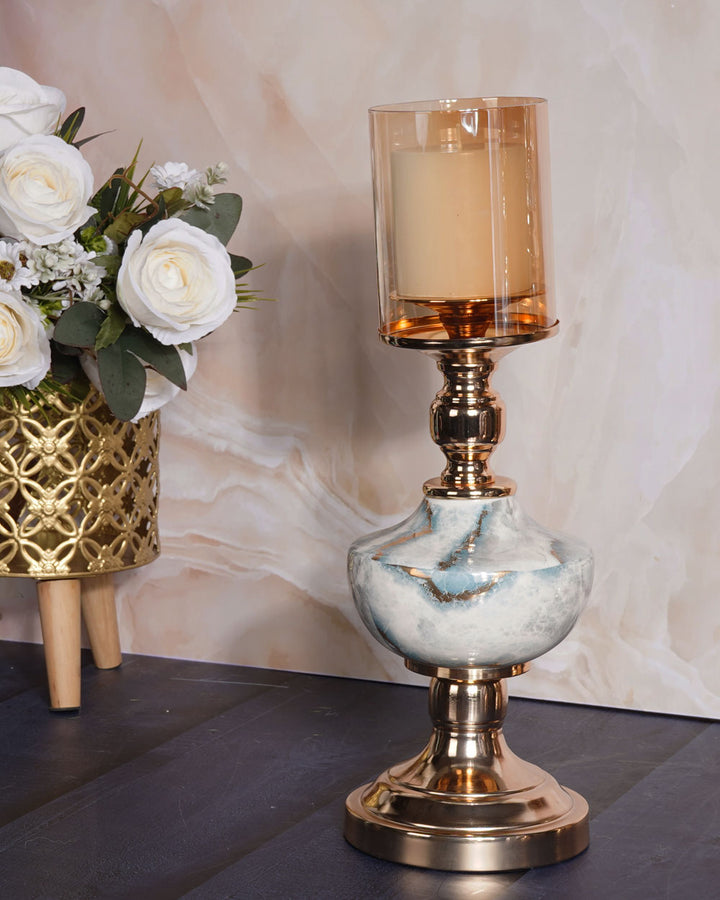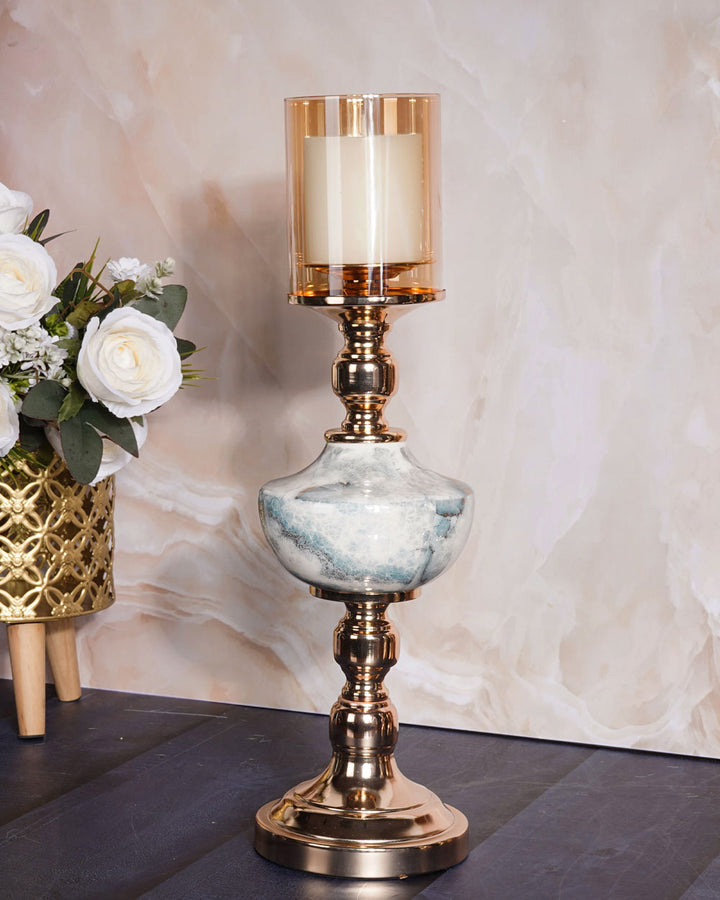 It supports a beautifully shaped stone-finish centerpiece that mimics natural marble with soft veining and smooth curves. Topping the design is a cylindrical tinted glass hurricane in a warm amber hue, ideal for housing a pillar candle and casting a soft, ambient glow.