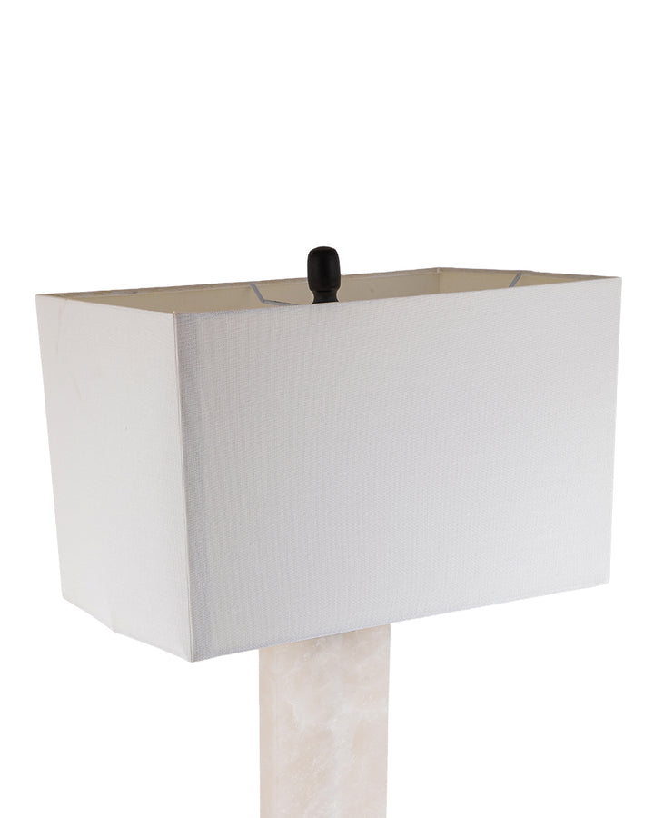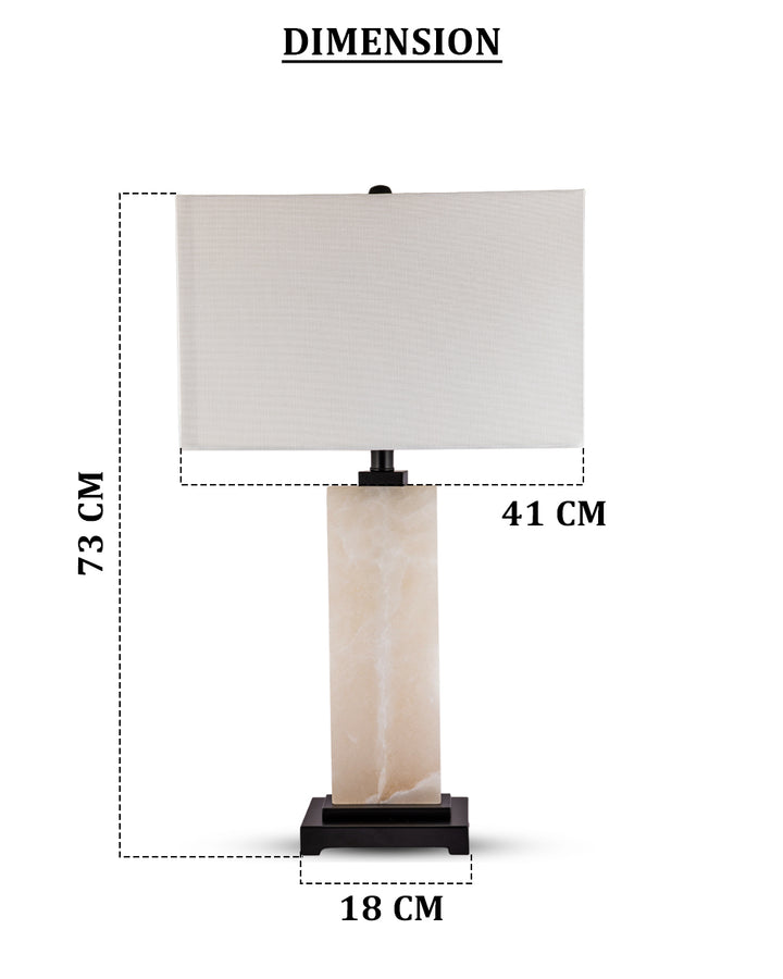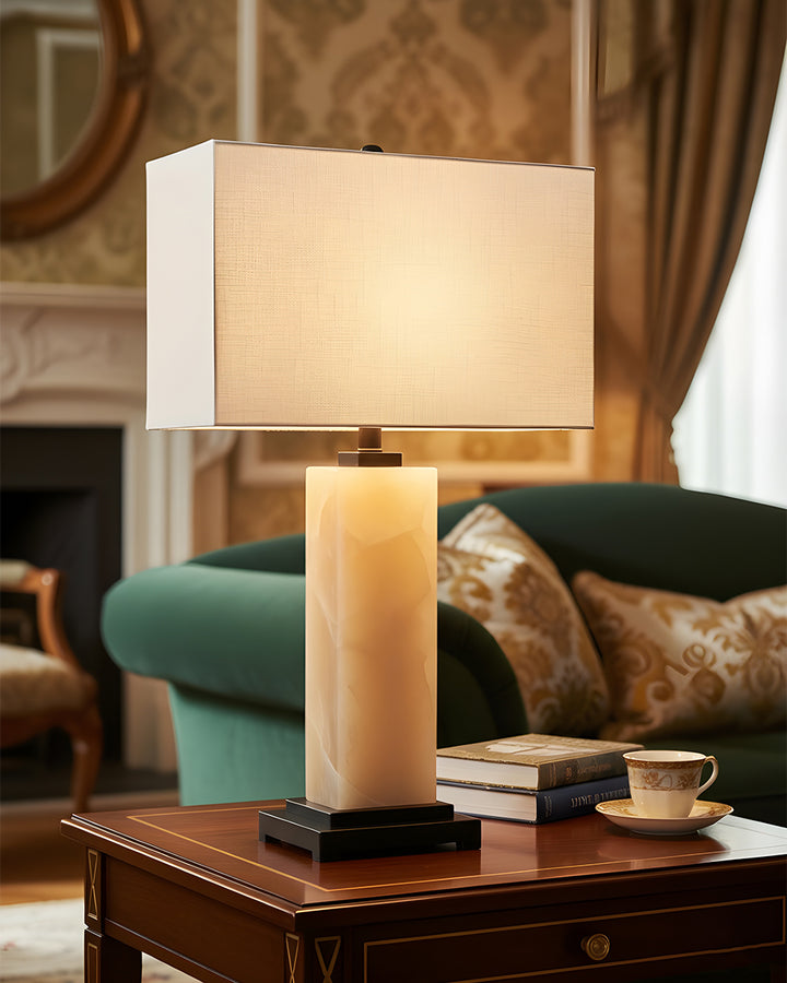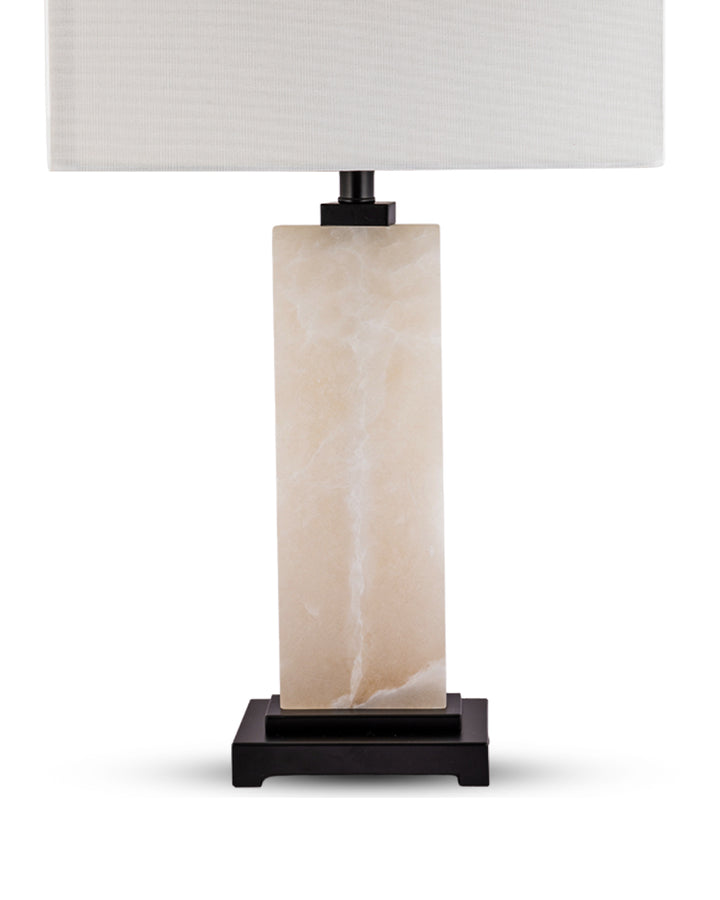 A luxurious, contemporary table lamp features a polished, rectangular onyx base with natural veining. A crisp, white rectangular shade sits atop. The lamp rests on a black square base.