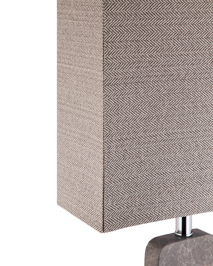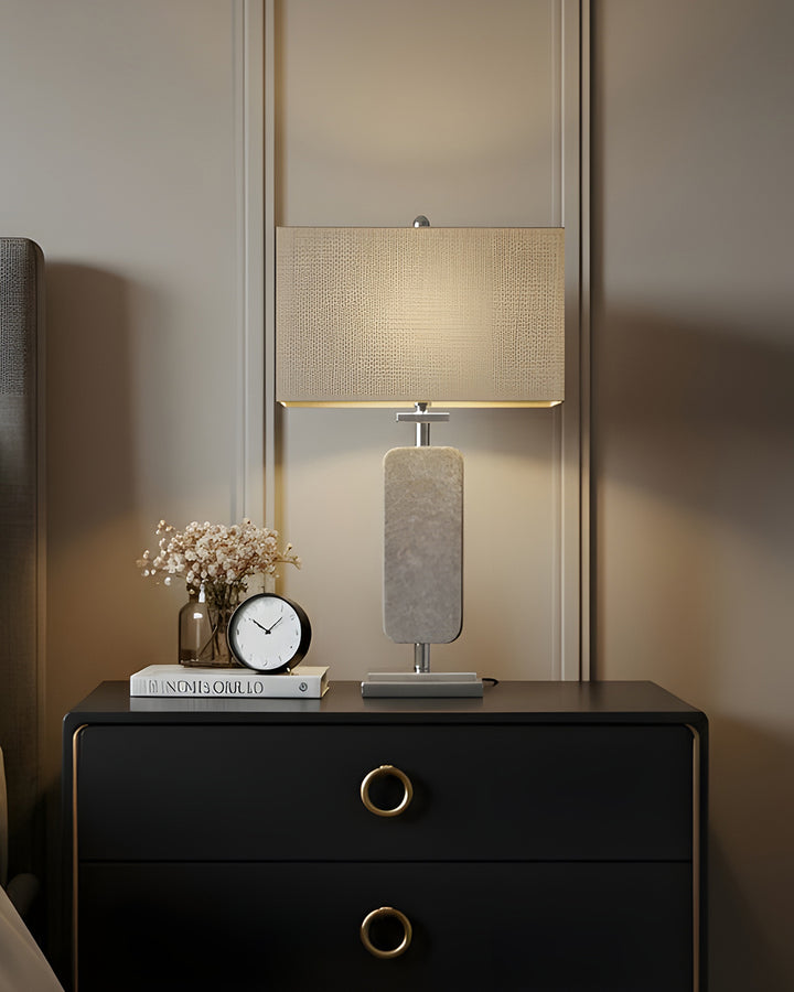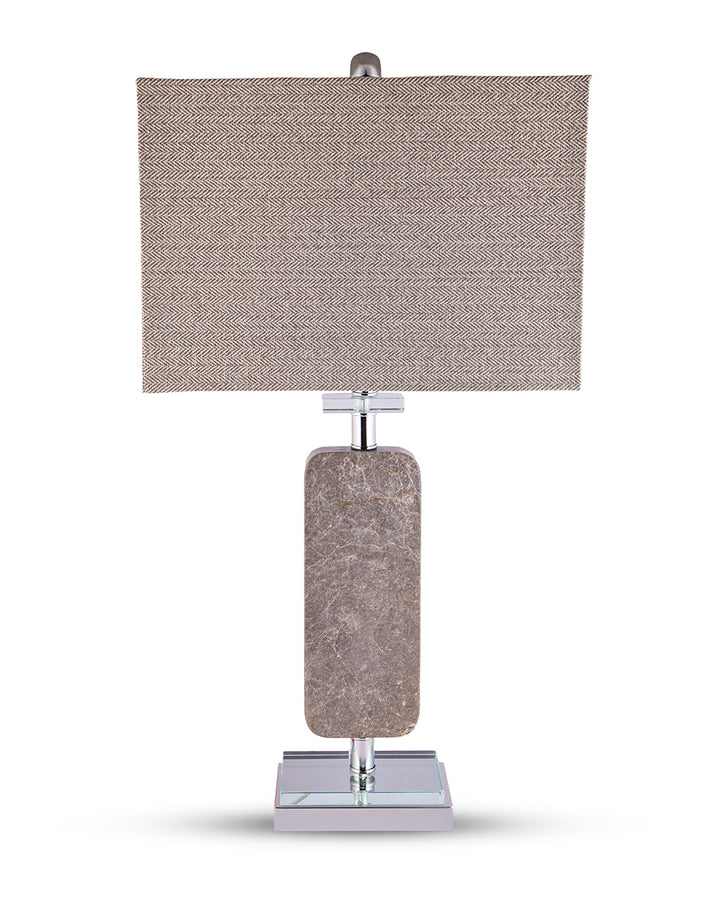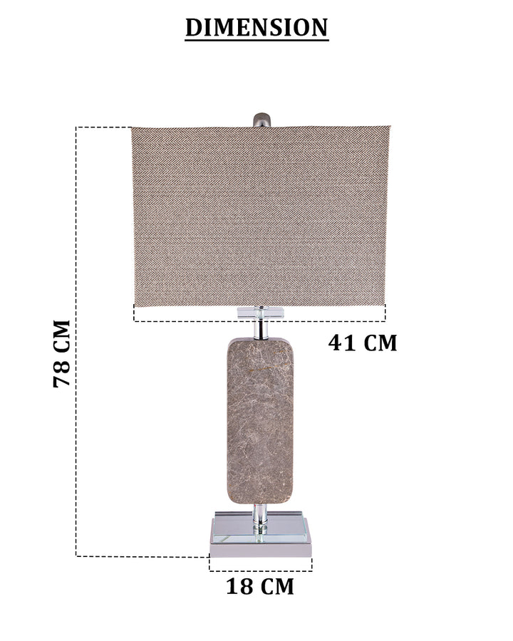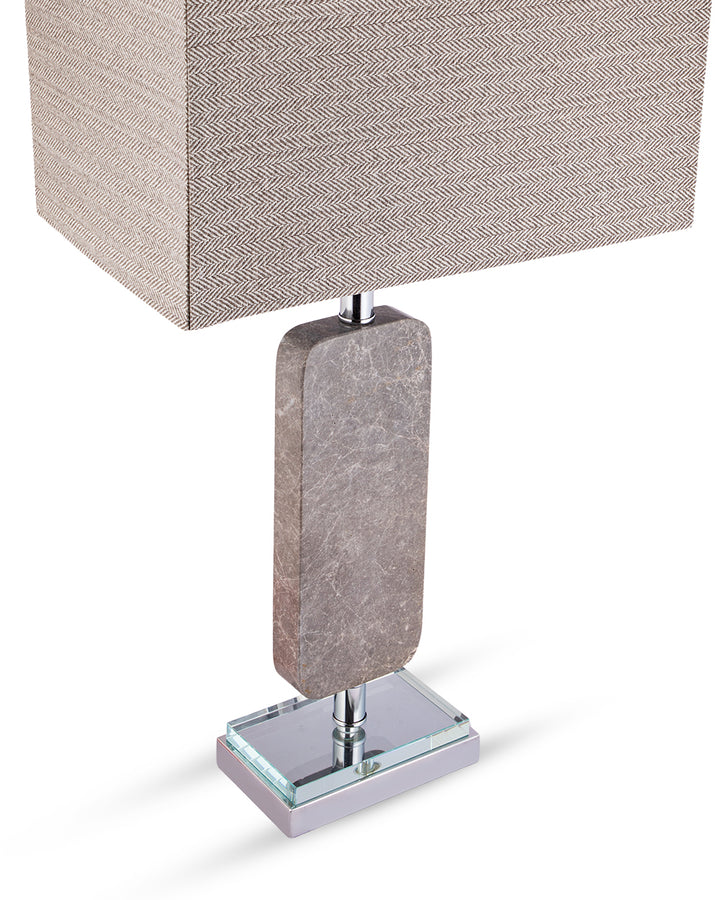 The lamp features a rectangular metal & glass base with a chrome metallic finish. The stand is a vertical, oval-shaped block with a dark marbled texture, giving it a contemporary look.