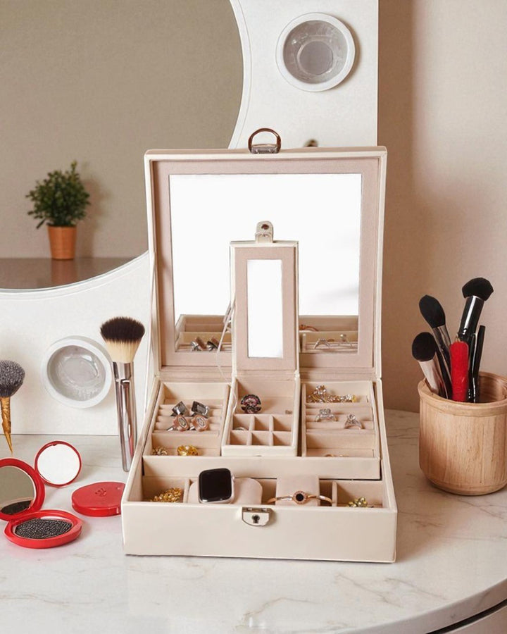 Designed with functionality in mind, it includes multiple compartments, ring holders, and necklace hooks to keep your jewellery organized and tangle-free. A compact mirror is conveniently placed inside for quick touch-ups, and a secure snap and lock closure ensures your treasures stay safe. Perfect for home organization or travel, this faux leather jewellery box makes a stylish and practical gift for any jewellery lover.
