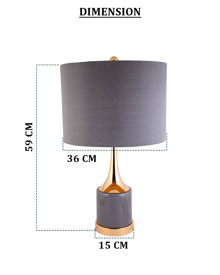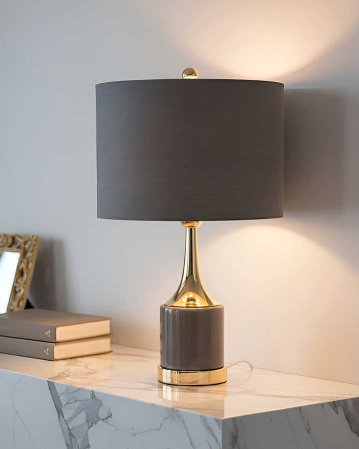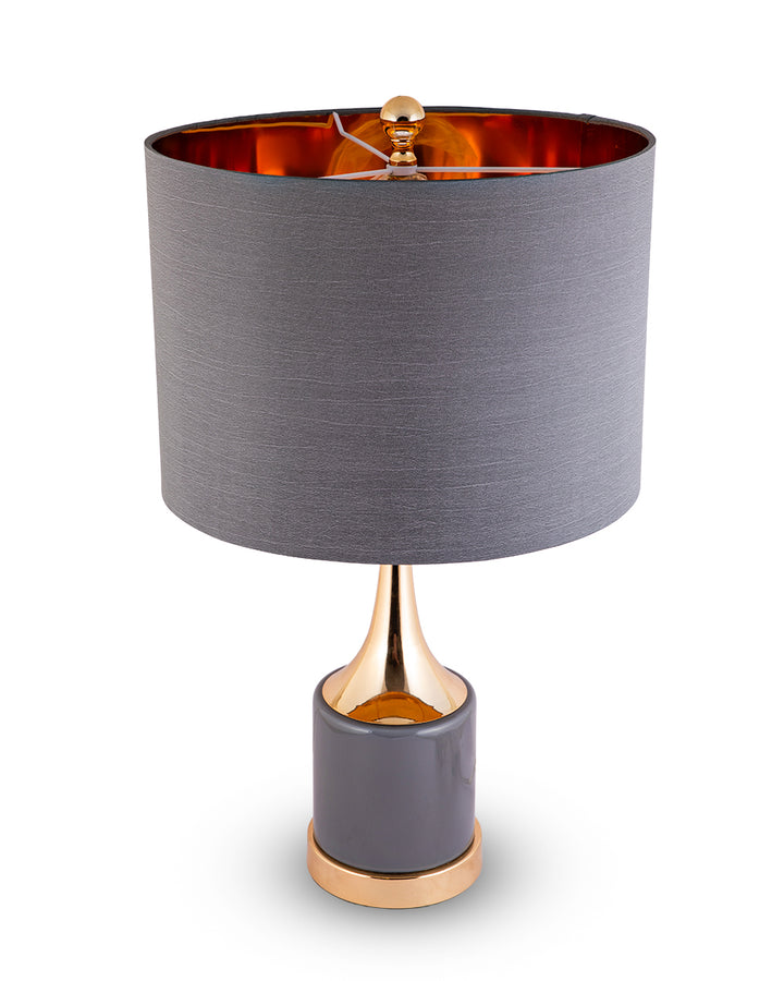 This luxurious table lamp dazzles with a sleek grey shade, lustrous gold accents, and a glossy grey base, creating a bold statement of modern opulence and sophistication.