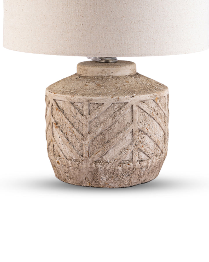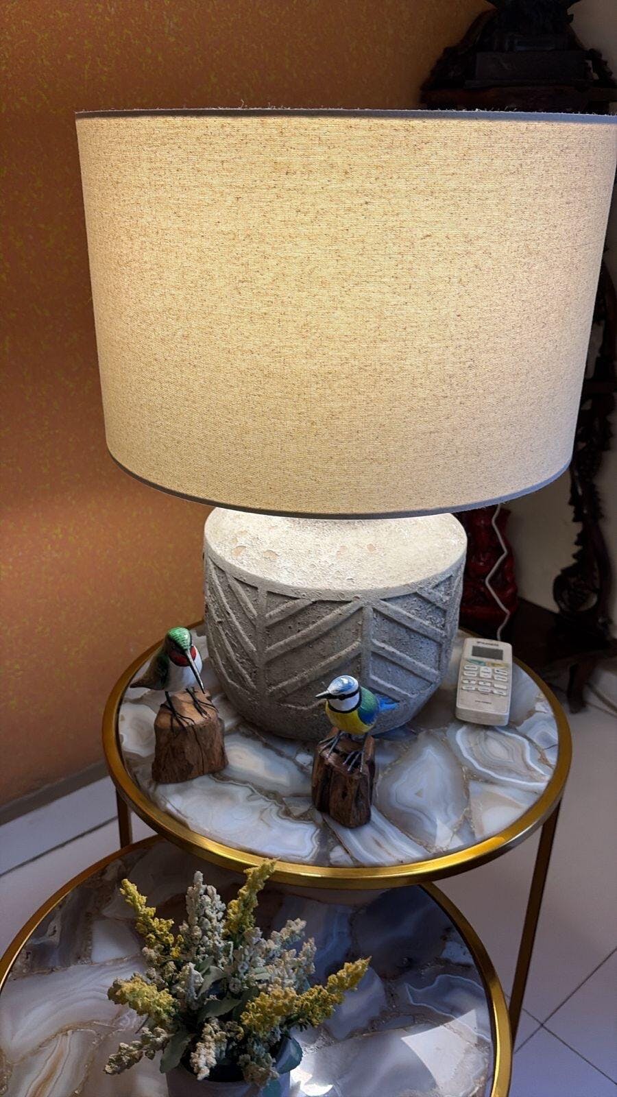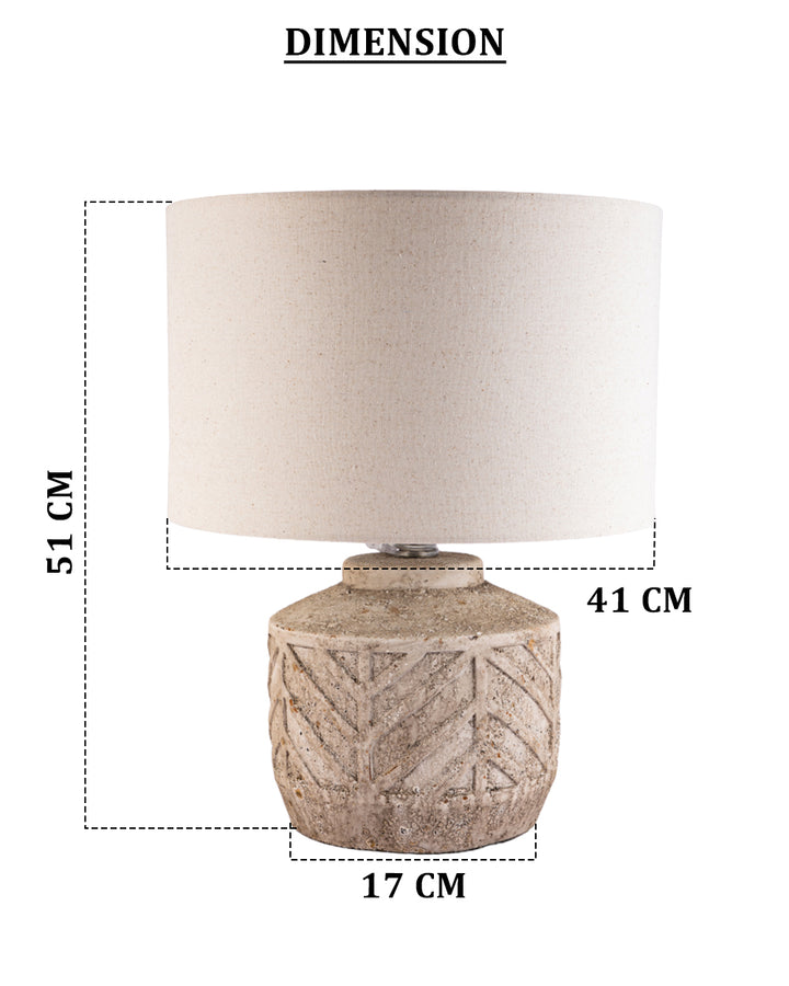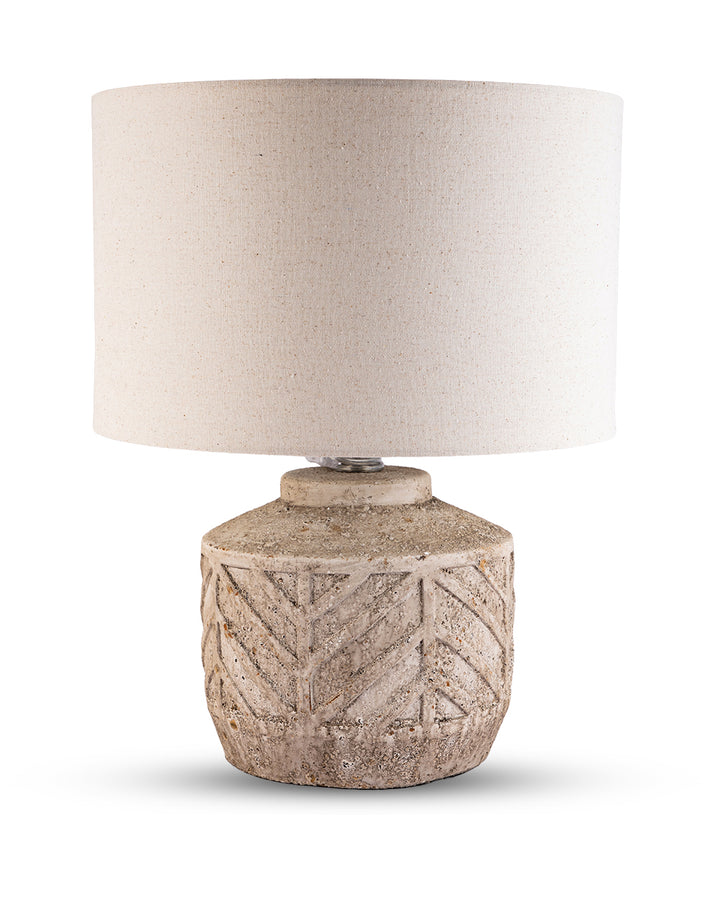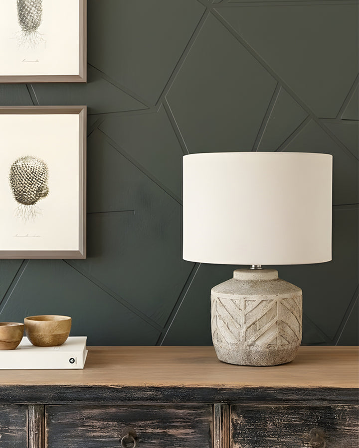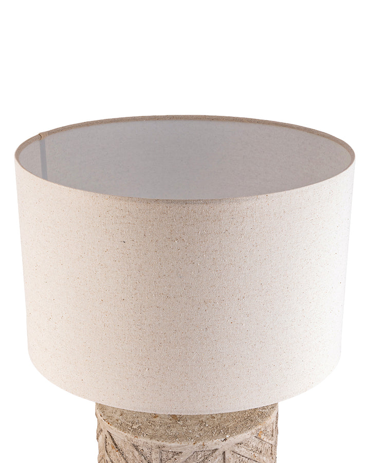 This lamp boasts a grand, textured beige shade paired with a sculpted stone base featuring elegant geometric carvings—an artful fusion of rustic charm and refined luxury.