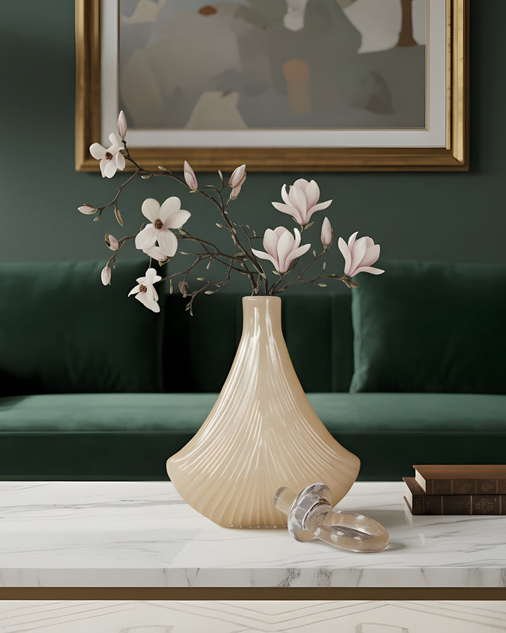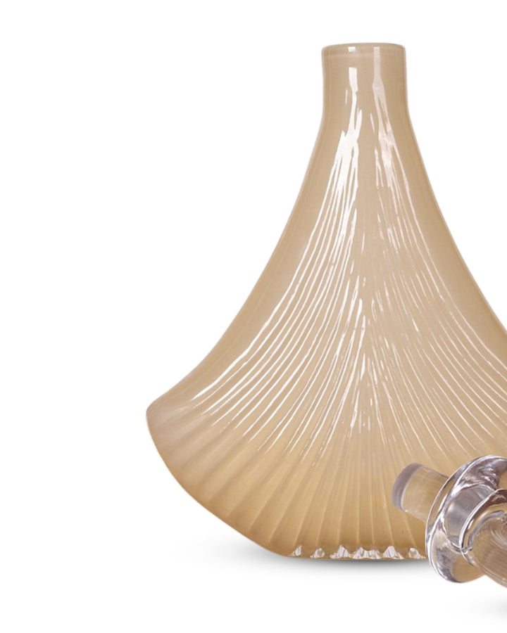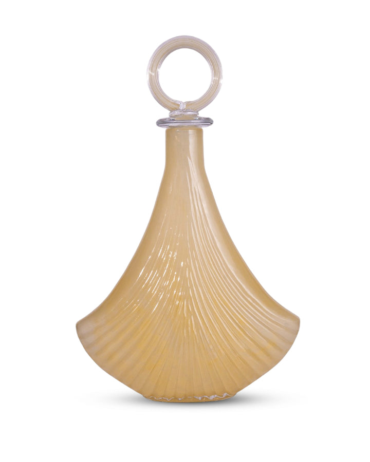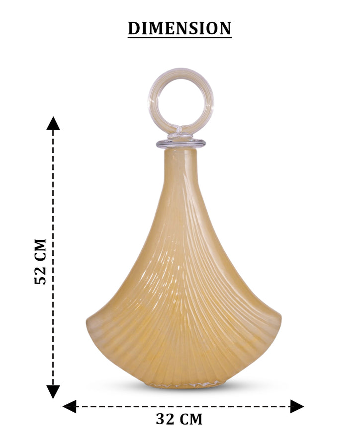 This decorative piece features an elegant, fan-shaped body with gentle, radiating ridges that resemble the delicate lines of a seashell or a pleated fabric. The glass is a soft, creamy beige hue, giving it a warm, vintage aesthetic. At the top, it has a sleek, narrow neck capped with a round, open-loop lid, made from clear glass, adding a modern touch to its classic form. Its design is both graceful and timeless, ideal for adding a refined touch to any interior space.