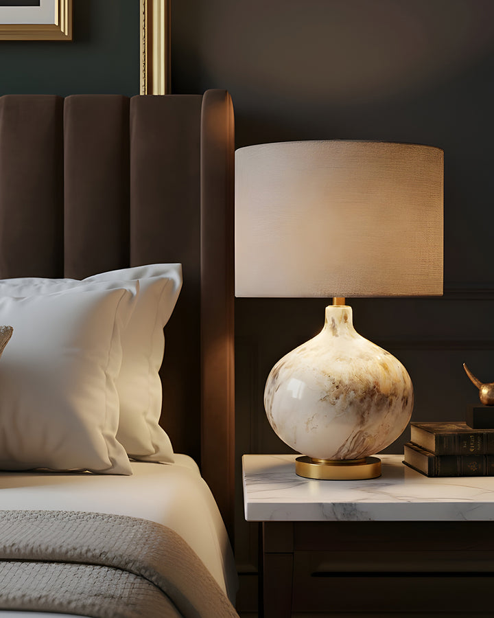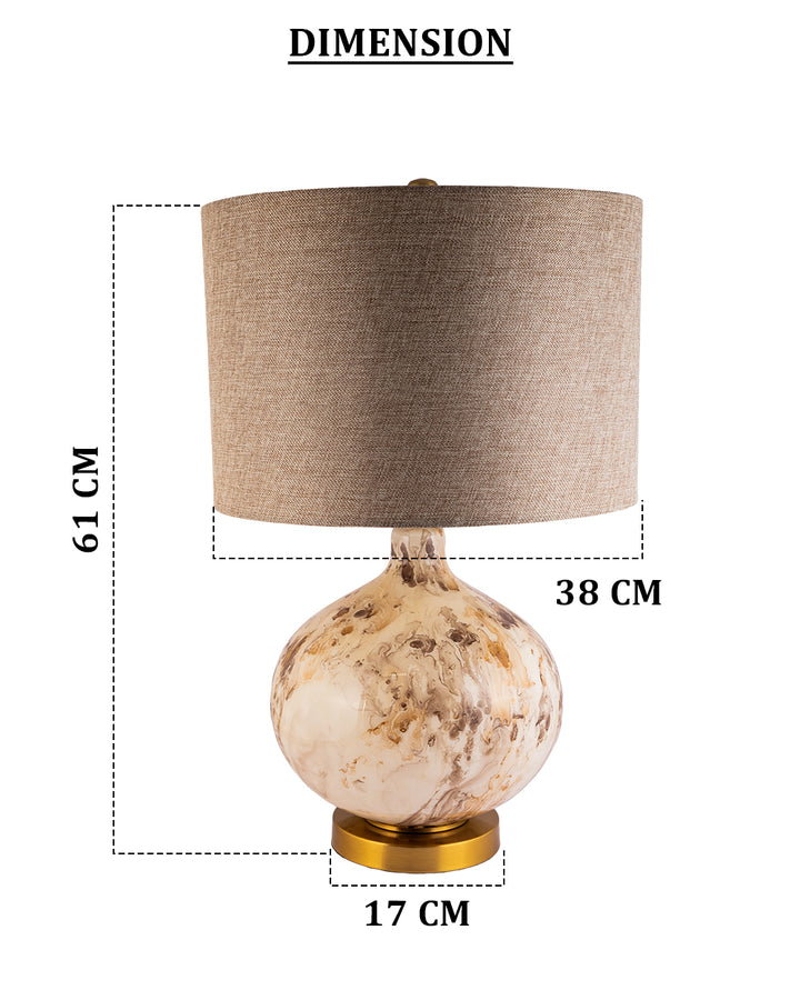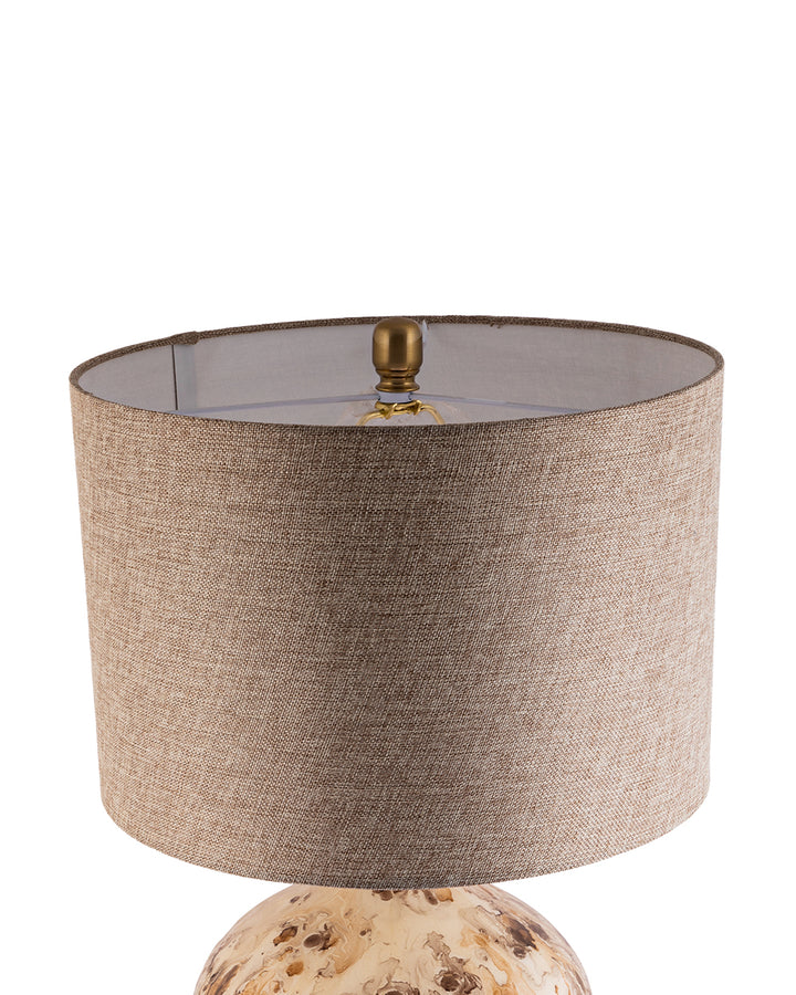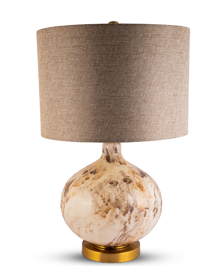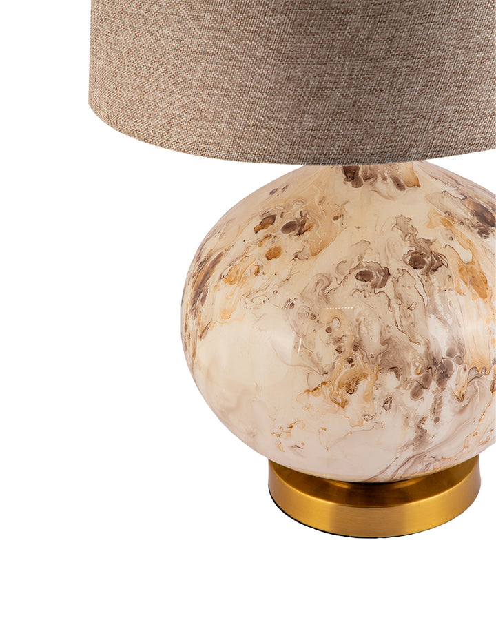 Elegant glass lamp with a swirling marble-like pattern in earthy tones, a gold-toned base, and a soft, neutral fabric shade.