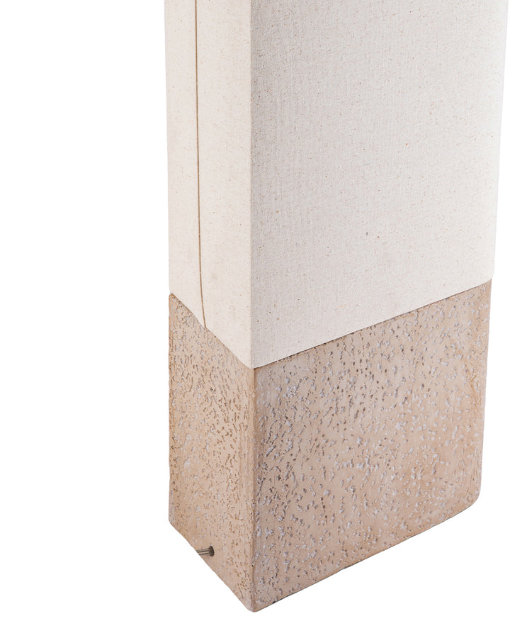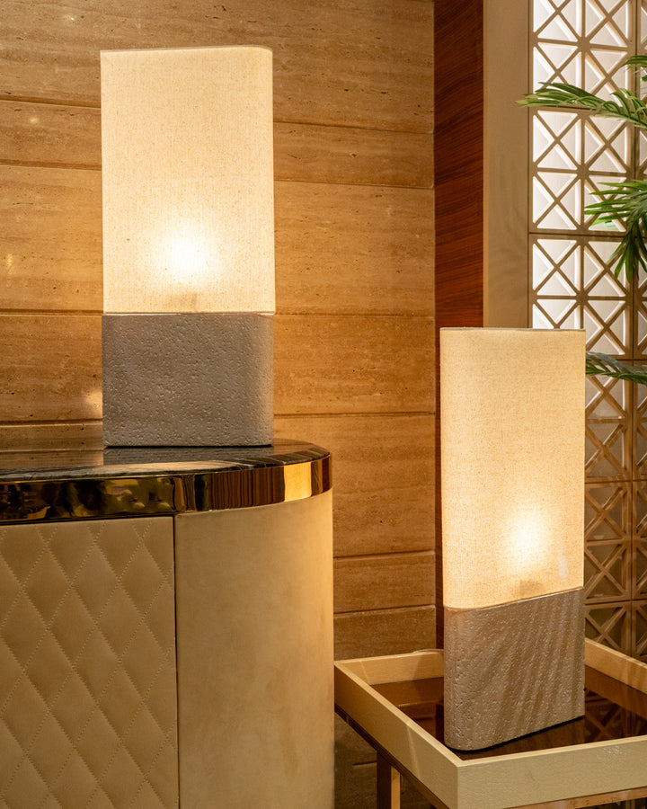The Terra Block Lamp features a bold rectangular stone-textured base paired with a sleek fabric shade. Its earthy elegance and clean lines bring modern sophistication to any interior space.