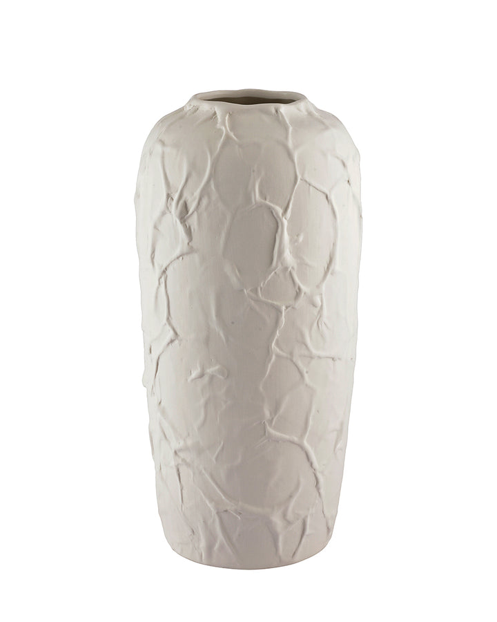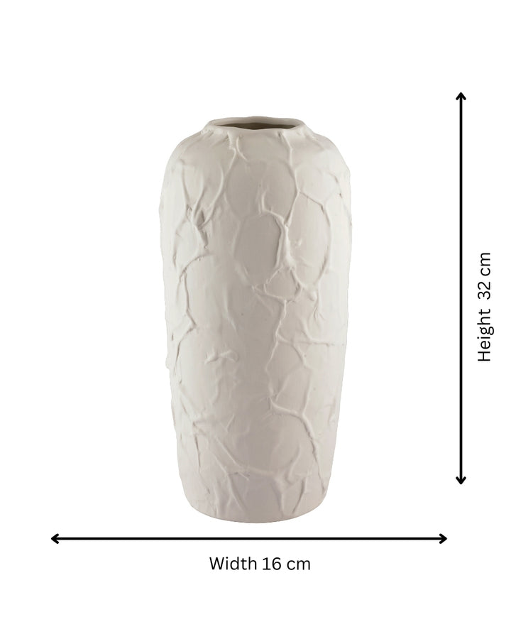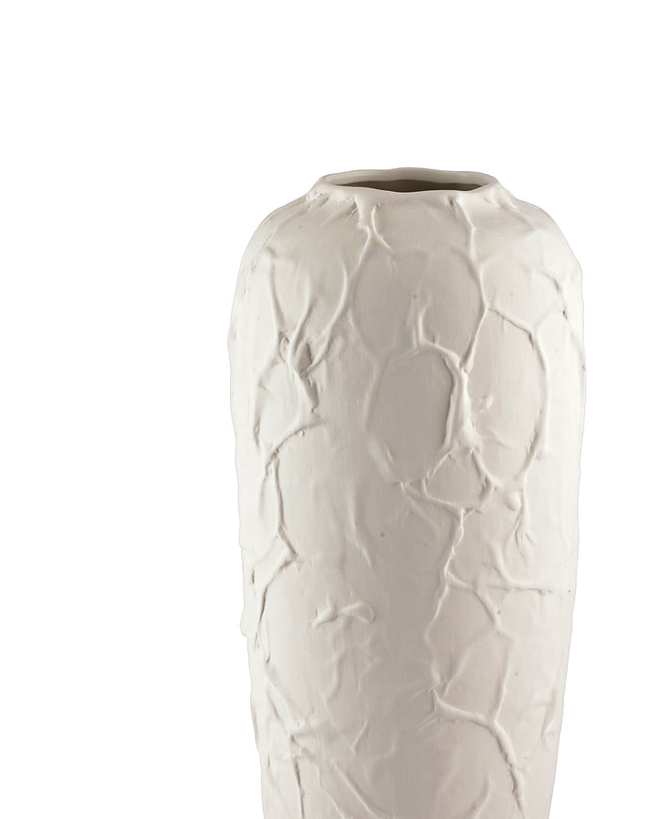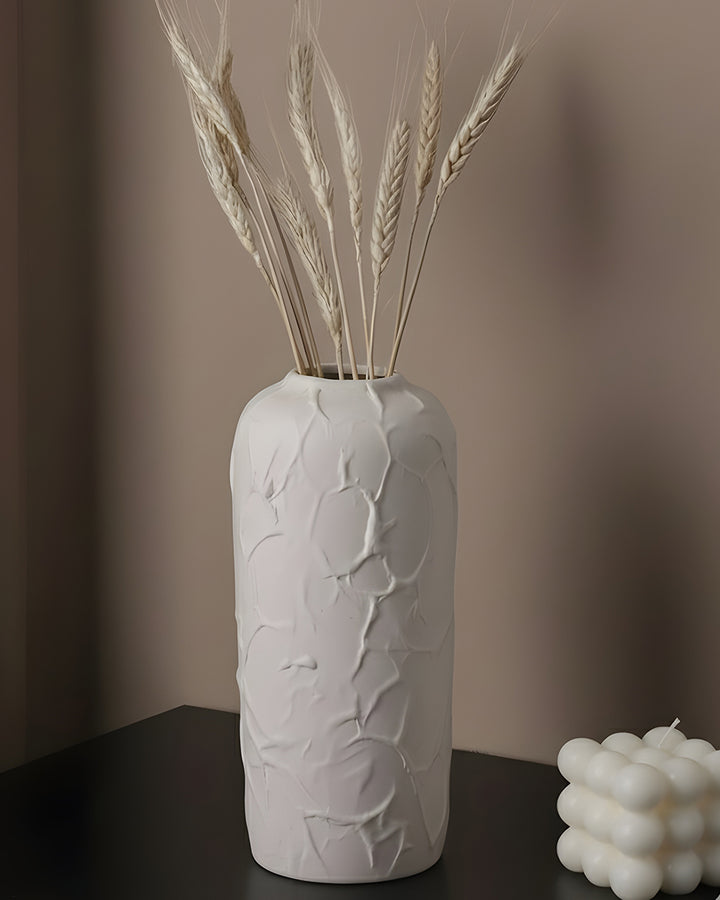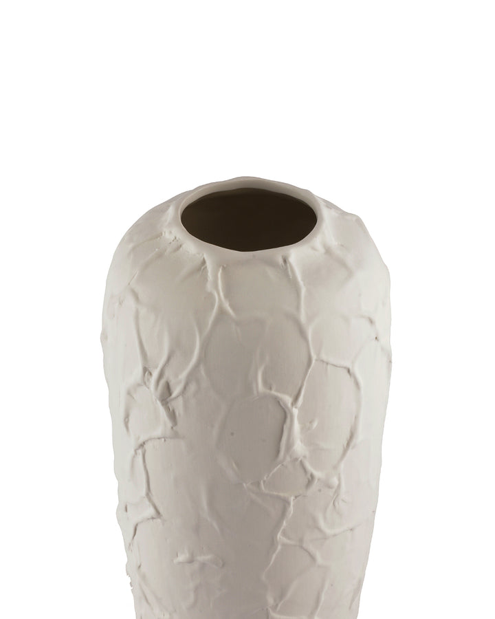 This ceramic white vase features a sleek, modern silhouette with a subtly organic twist. Its surface has a unique crumpled or creased texture, resembling gently wrinkled paper or fabric, which gives it a soft, naturalistic character despite its minimalist design.