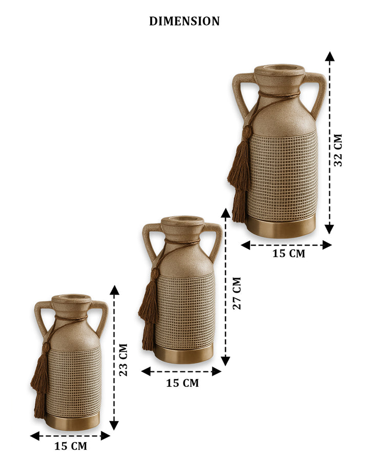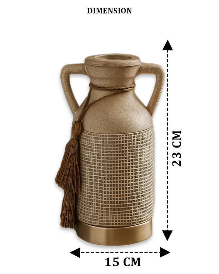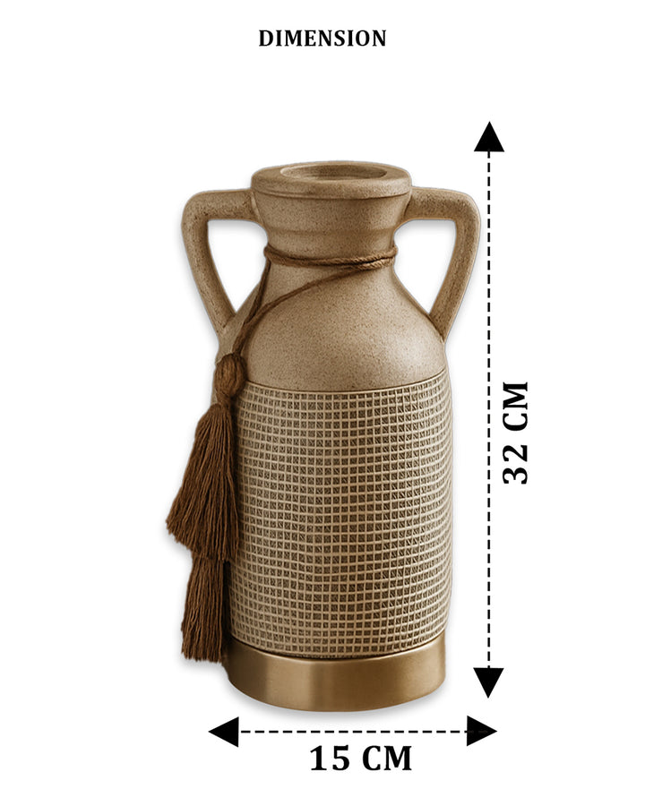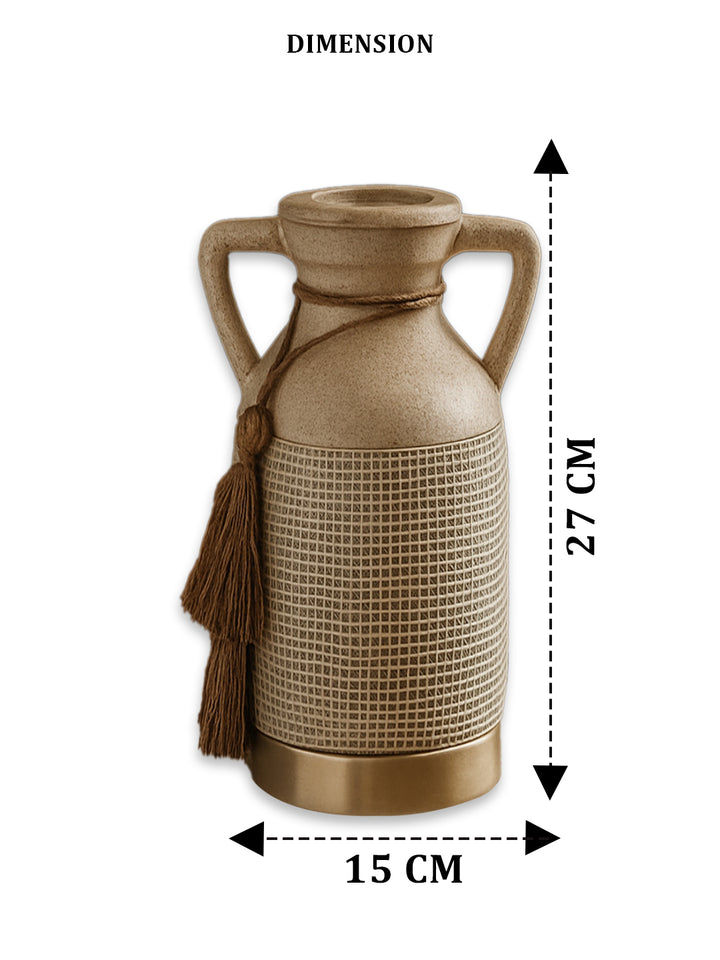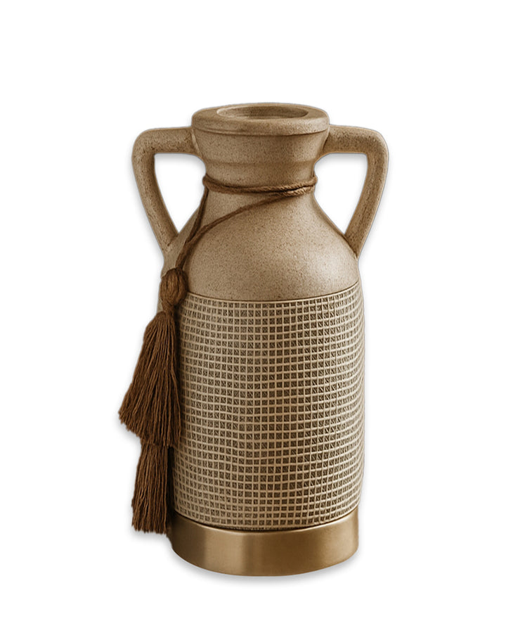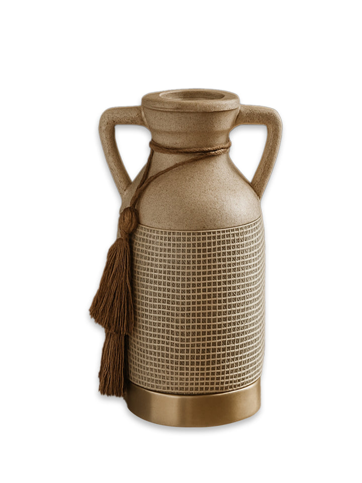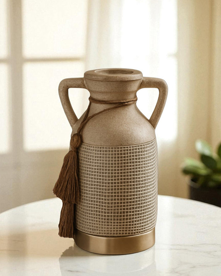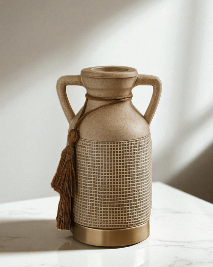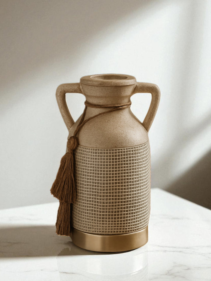 The vase is equipped with two sturdy side handles, giving it an amphora-like shape reminiscent of ancient pottery. Around the neck, a brown cord is wrapped and adorned with two long, matching tassels that enhance its decorative appeal. The base is finished with a metallic band, likely in a brushed gold or bronze tone, which adds a refined, modern touch to the otherwise vintage-inspired design.