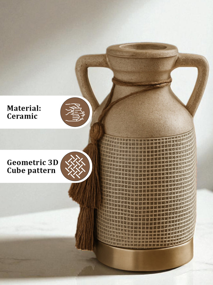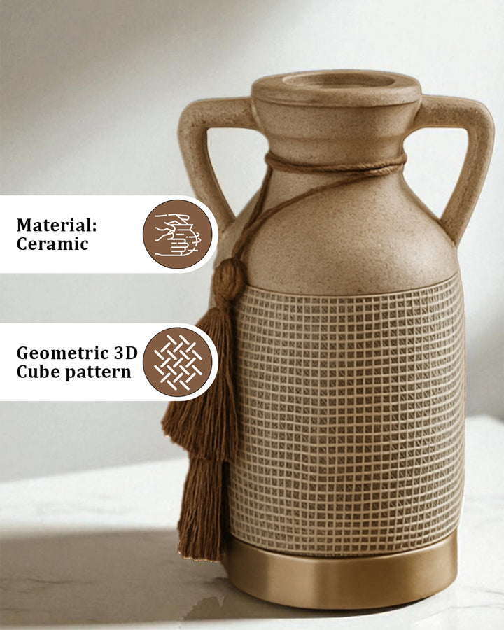 This ceramic vase showcases a beautiful blend of rustic charm and classic elegance. Its design features a dual-texture surface the upper part has a finely cracked, antique-style texture, while the lower part is covered in a raised grid or waffle-like pattern that adds a tactile, handcrafted feel.