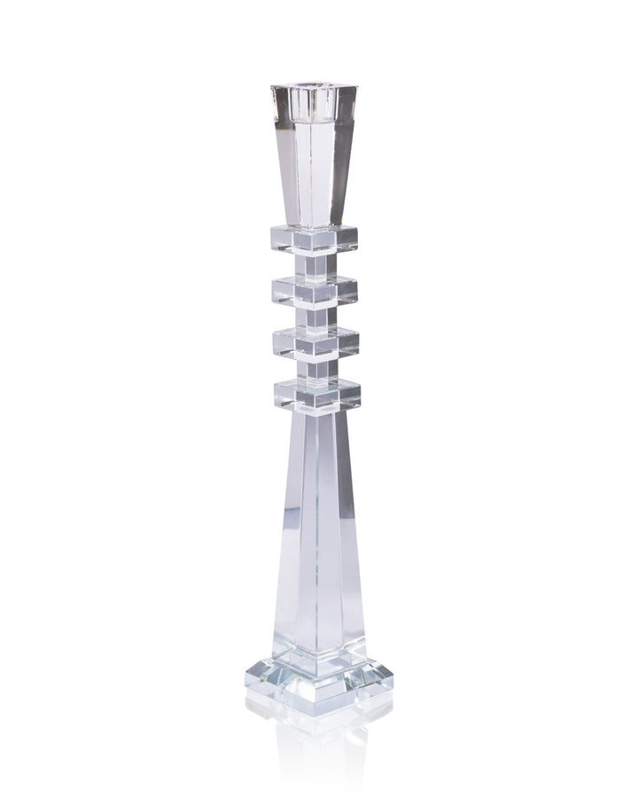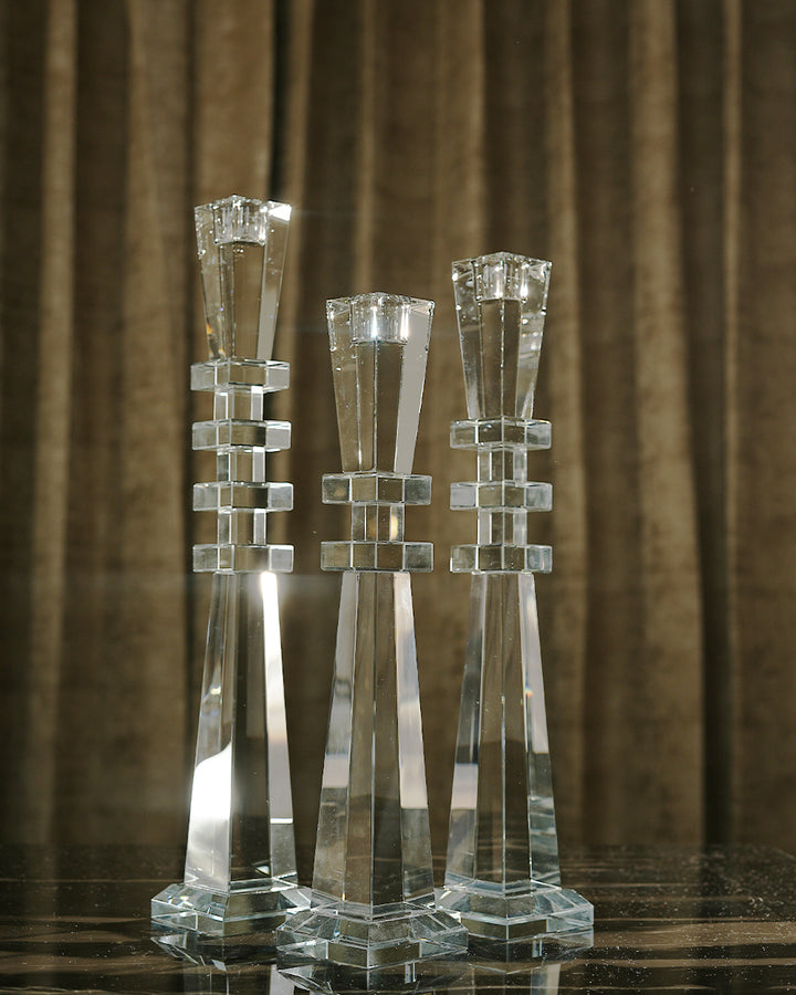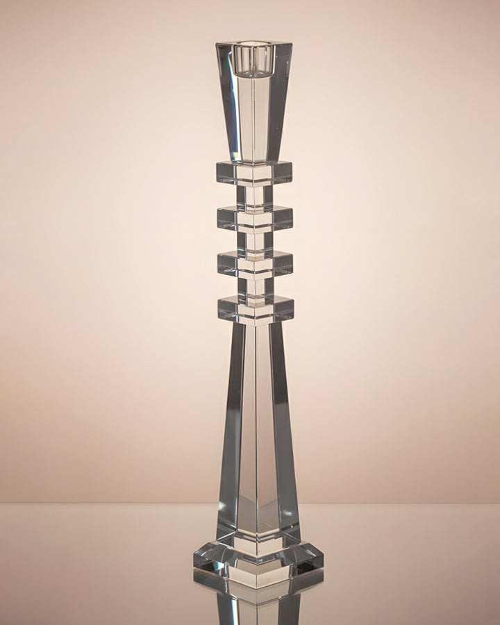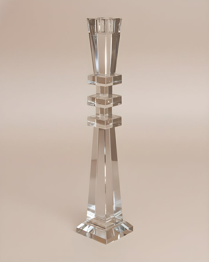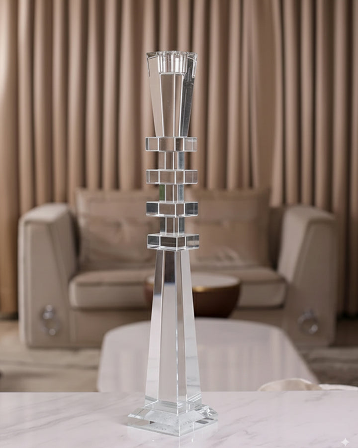 This striking crystal candle stand features a unique architectural silhouette with bold, geometric detailing. A modern interpretation of classical form, the design combines clean lines and stacked symmetry to create a visually captivating decor piece.