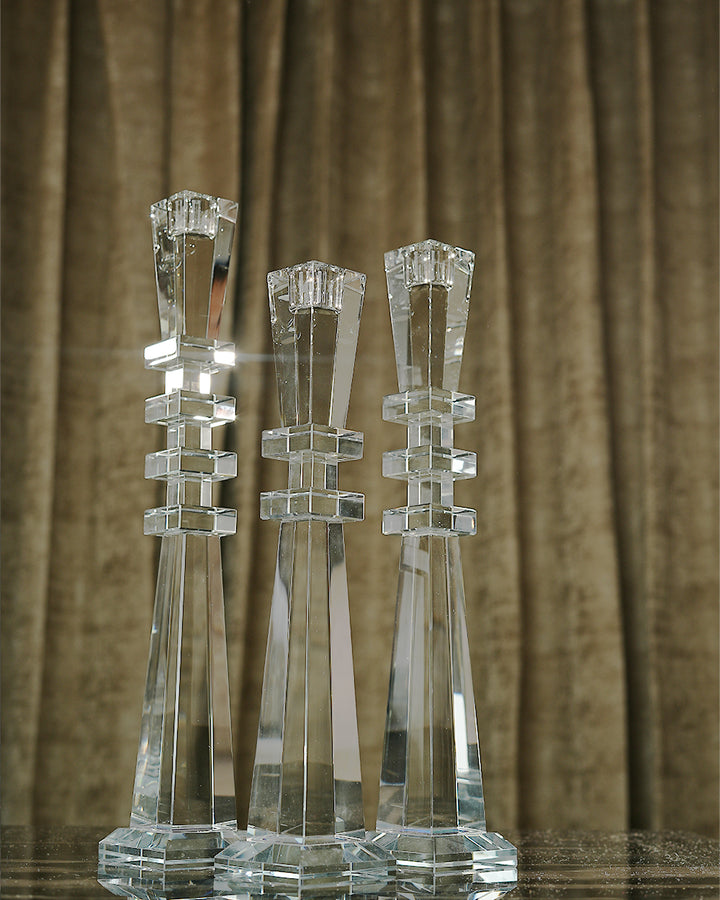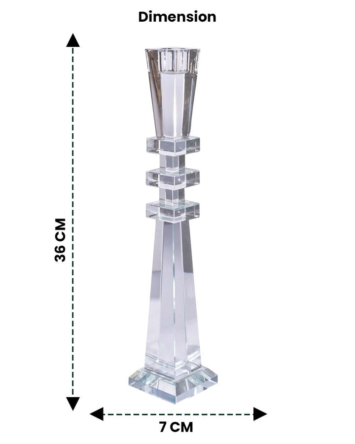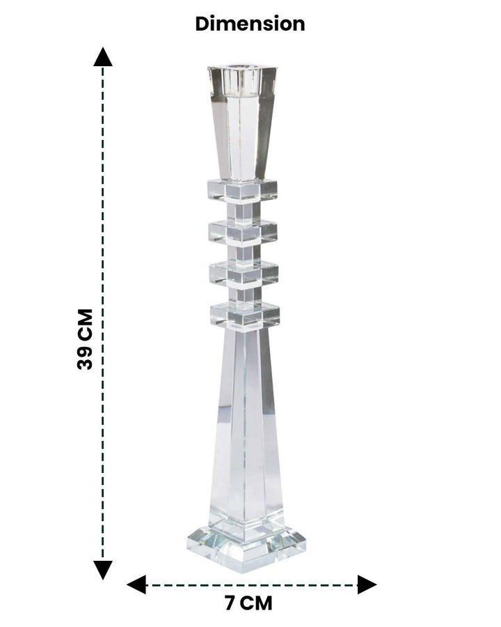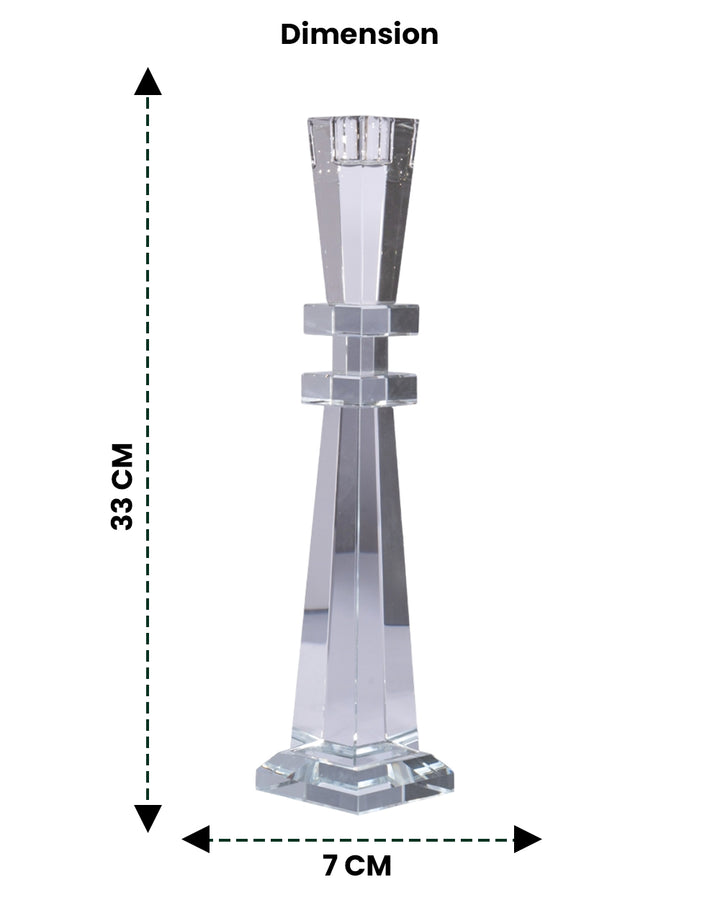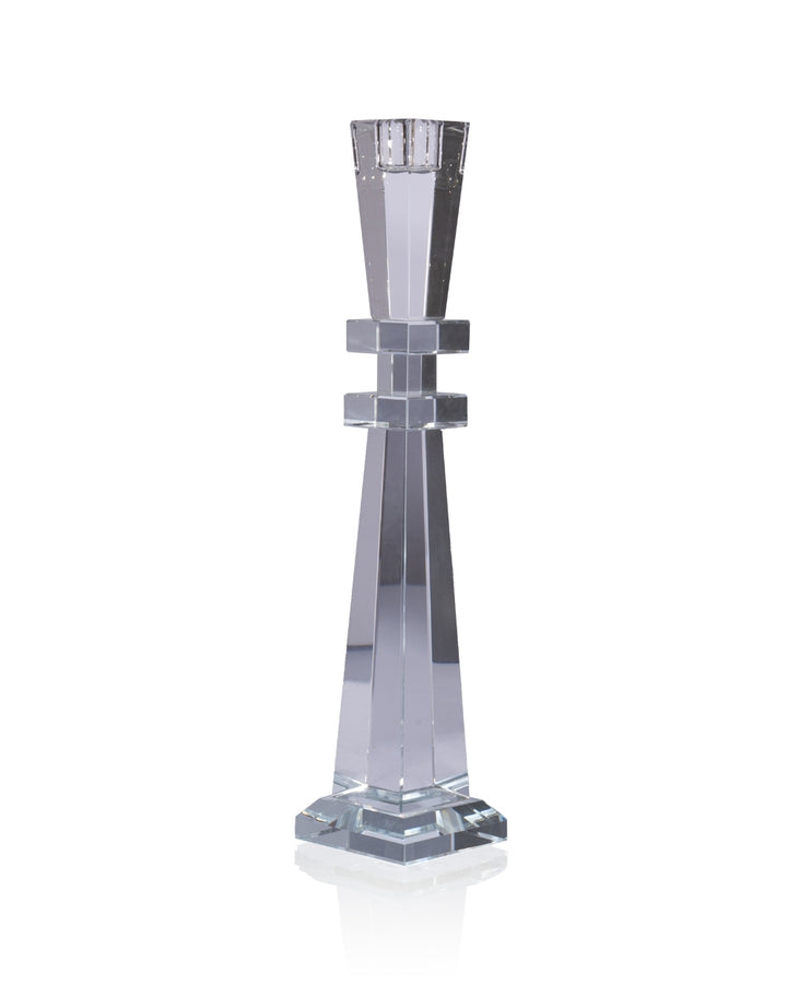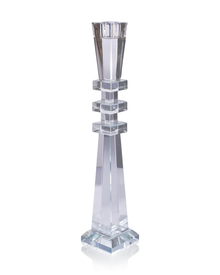 This striking crystal candle stand features a unique architectural silhouette with bold, geometric detailing. A modern interpretation of classical form, the design combines clean lines and stacked symmetry to create a visually captivating decor piece.
