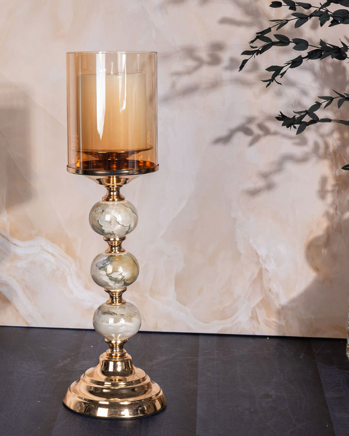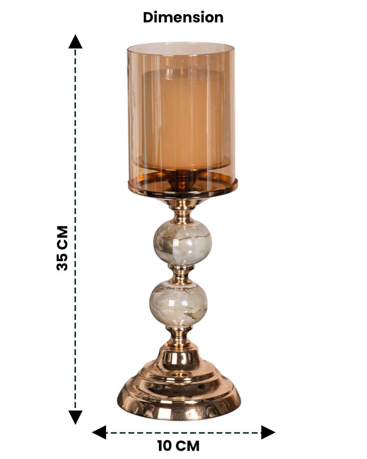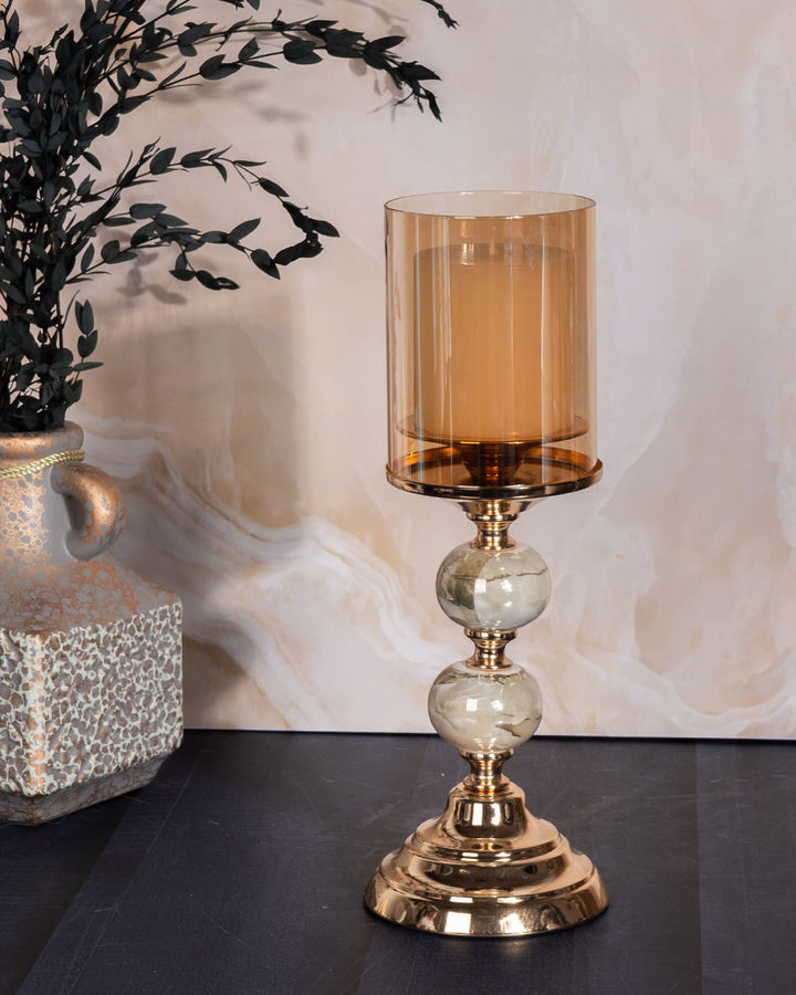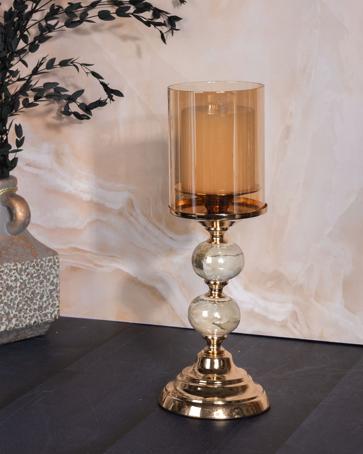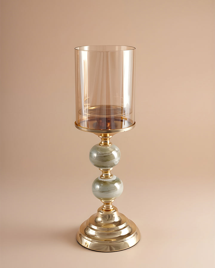• Shade: Tall amber-tinted glass cylinder that casts a warm, inviting glow when lit.