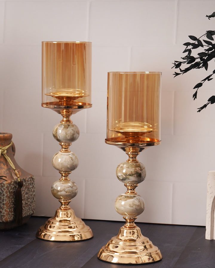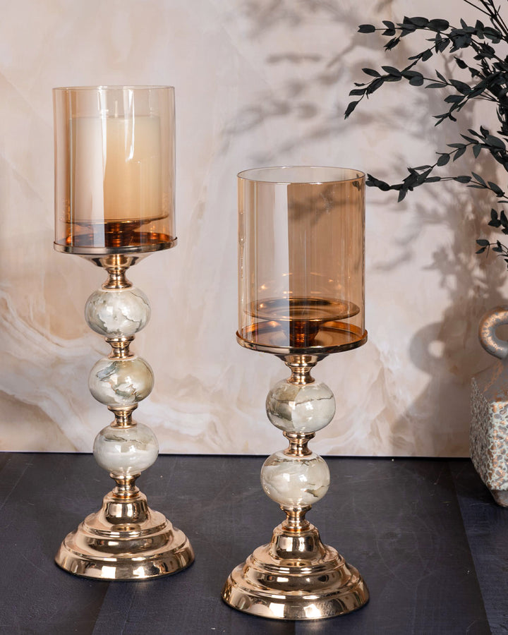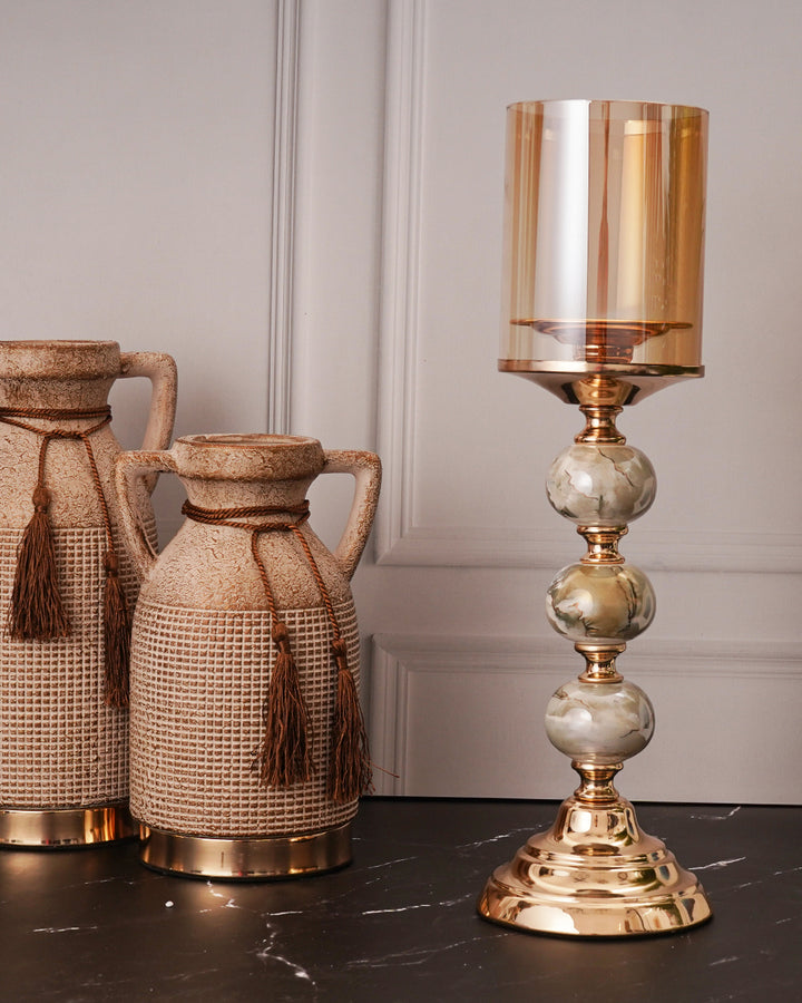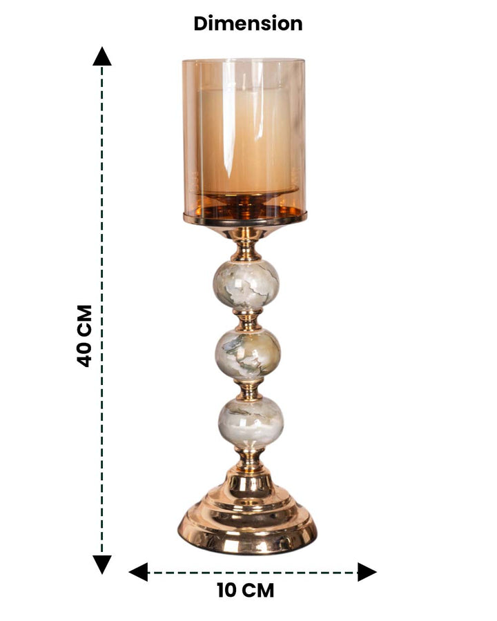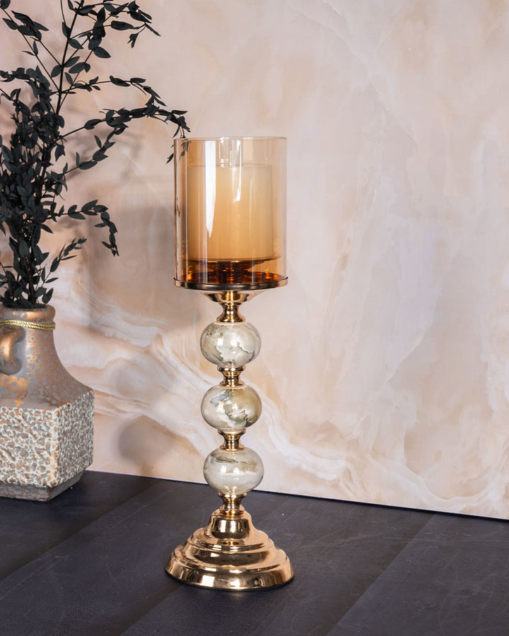 • Shade: Tall amber-tinted glass cylinder that casts a warm, inviting glow when lit.
