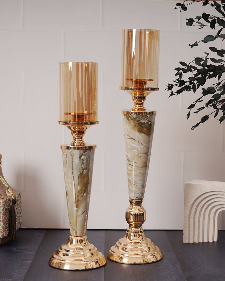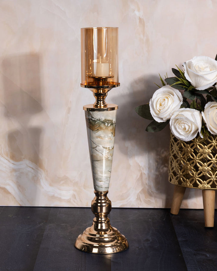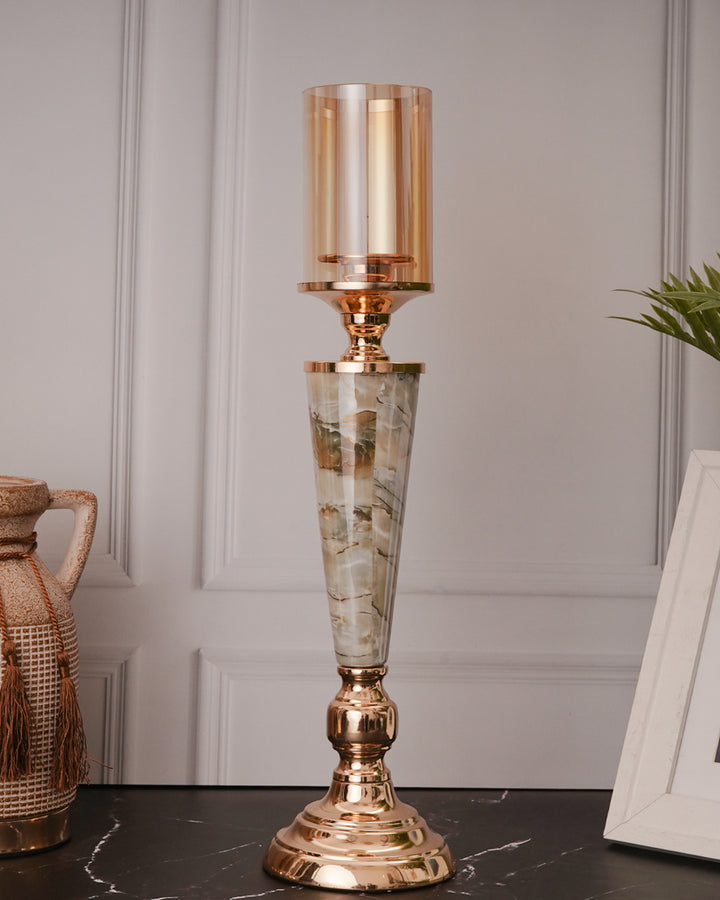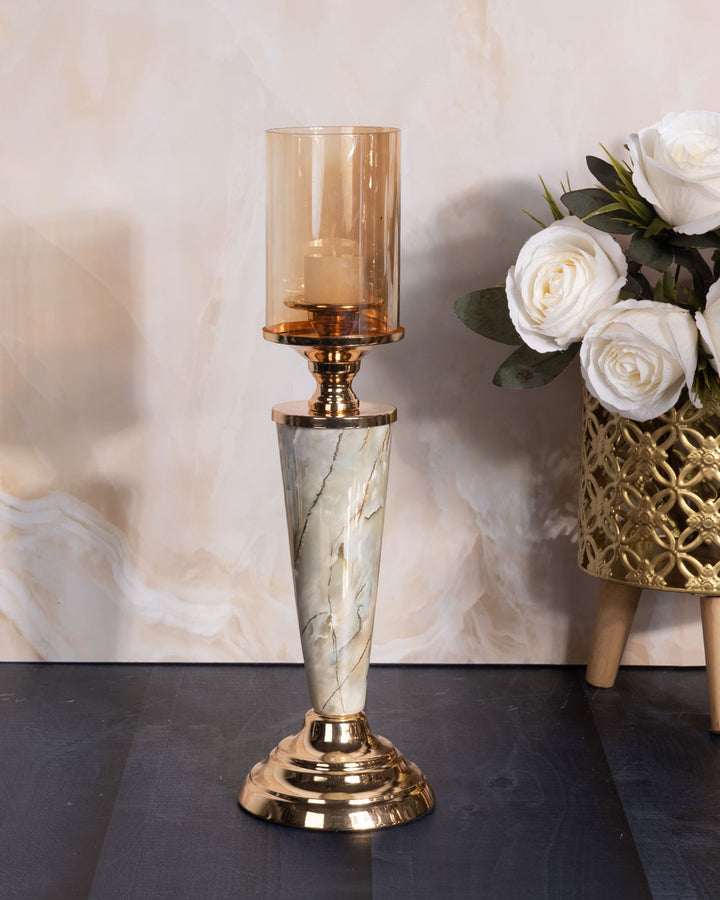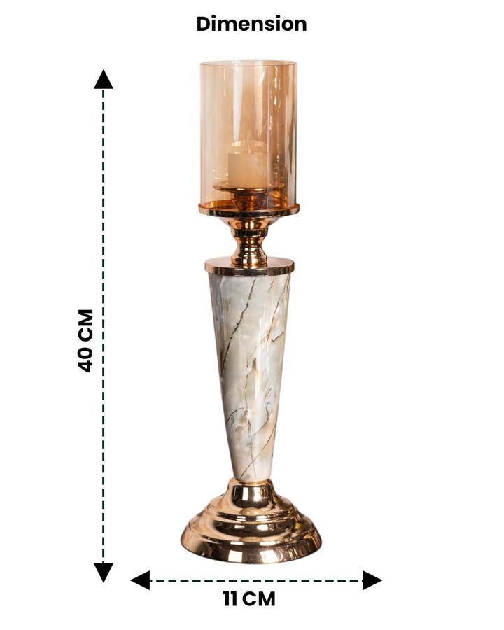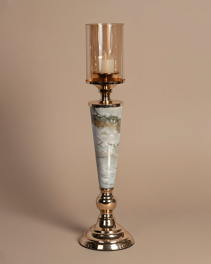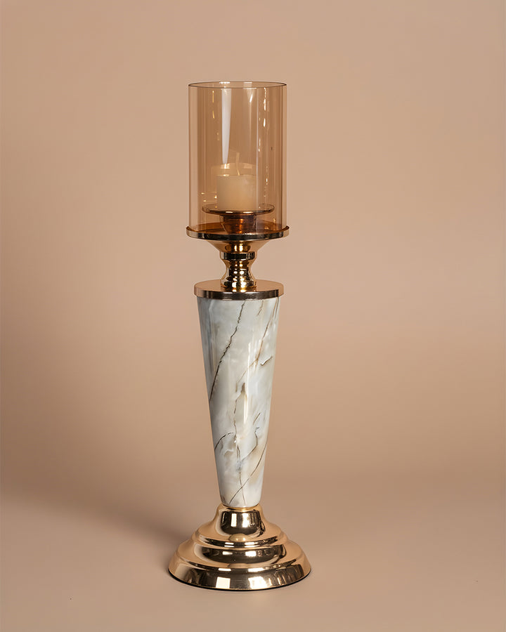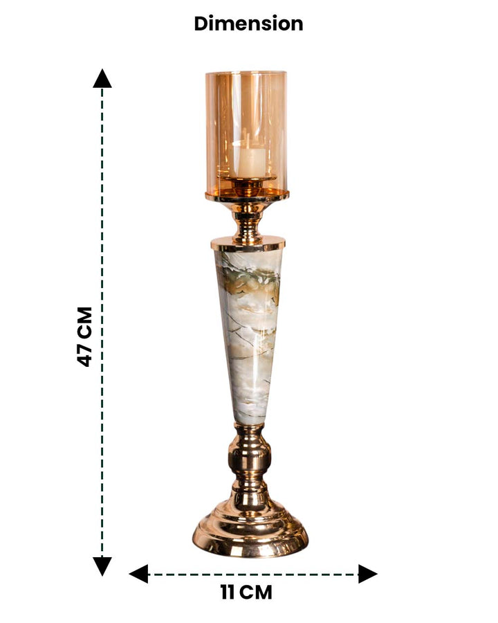 Elegance and warmth to your décor with this beautifully crafted metal candle stand, featuring a sophisticated marble-finish center column, a sleek gold-toned base, and a gently tinted glass shade. A perfect blend of luxury and function, it enhances both contemporary and classic interiors.